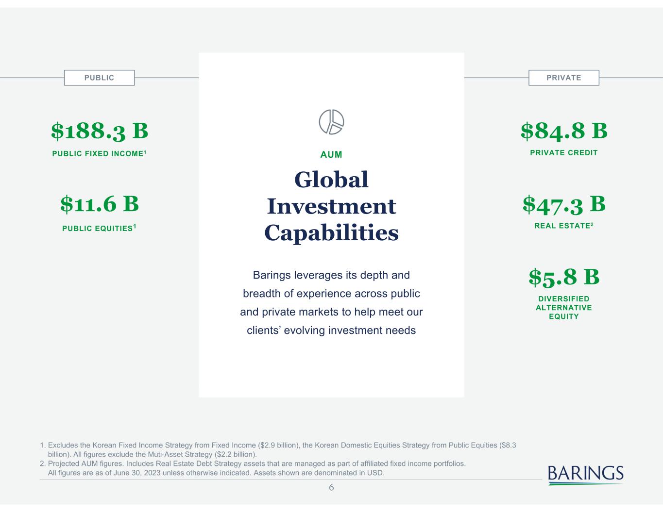 5 Today’s Barings TIMELINE FOR 1940 1995 2005 20092000 2002 2004 David L. Babson & Co. Inc. (Babson) is Established Boston-based firm that specializes in growth equities MassMutual acquires Babson Babson Launches Innovative Global Loan Strategy One of the first funds to invest across U.S. and European Loans 2010 20222015 2016 2018// MassMutual Merges Investment Division with Babson Babson Acquires Institutional Debt Management (IDM) U.S. leveraged loan business Babson Acquires Duke Street Capital Debt Management Leveraged loan business that allows firm to gain a presence in Europe Babson Establishes Real Assets Joint Venture: Wood Creek Capital Management Broadens firm's alternatives platform by enhancing capabilities Cornerstone Real Estate Advisors (Cornerstone) Acquires London- Based Protego Real Estate Investors Today’s Barings is Formed MassMutual brings together Barings, Babson, Cornerstone and Wood Creek to create one global, diversified asset management organization Barings Becomes Manager to Triangle Capital Corporation (Renamed Barings BDC Inc.) Publicly listed business development company (BDC) making middle market investments Barings Acquires Altis Property Partners This acquisition helps build out our real estate platform in Asia Pacific Babson Launches First Global Private Loan Fund
