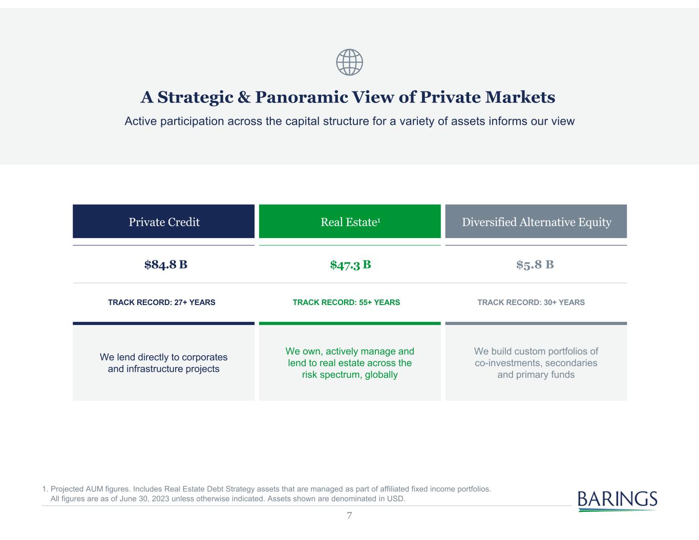 6 1. Excludes the Korean Fixed Income Strategy from Fixed Income ($2.9 billion), the Korean Domestic Equities Strategy from Public Equities ($8.3 billion). All figures exclude the Muti-Asset Strategy ($2.2 billion). 2. Projected AUM figures. Includes Real Estate Debt Strategy assets that are managed as part of affiliated fixed income portfolios. All figures are as of June 30, 2023 unless otherwise indicated. Assets shown are denominated in USD. $11.6 B PUBLIC EQUITIES1 $188.3 B PUBLIC FIXED INCOME1 PUBLIC $84.8 B PRIVATE CREDIT $47.3 B REAL ESTATE2 $5.8 B DIVERSIFIED ALTERNATIVE EQUITY PRIVATE Global Investment Capabilities Barings leverages its depth and breadth of experience across public and private markets to help meet our clients’ evolving investment needs AUM