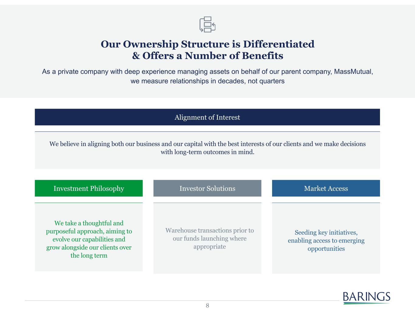 7 Private Credit Real Estate1 Diversified Alternative Equity $84.8 B $47.3 B $5.8 B TRACK RECORD: 27+ YEARS TRACK RECORD: 55+ YEARS TRACK RECORD: 30+ YEARS We lend directly to corporates and infrastructure projects A Strategic & Panoramic View of Private Markets Active participation across the capital structure for a variety of assets informs our view We own, actively manage and lend to real estate across the risk spectrum, globally We build custom portfolios of co-investments, secondaries and primary funds 1. Projected AUM figures. Includes Real Estate Debt Strategy assets that are managed as part of affiliated fixed income portfolios. All figures are as of June 30, 2023 unless otherwise indicated. Assets shown are denominated in USD.