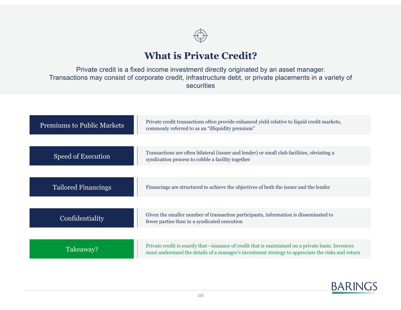 10 What is Private Credit? Private credit is a fixed income investment directly originated by an asset manager. Transactions may consist of corporate credit, infrastructure debt, or private placements in a variety of securities Premiums to Public Markets Private credit transactions often provide enhanced yield relative to liquid credit markets, commonly referred to as an “illiquidity premium” Speed of Execution Transactions are often bilateral (issuer and lender) or small club facilities, obviating a syndication process to cobble a facility together Tailored Financings Financings are structured to achieve the objectives of both the issuer and the lender Confidentiality Given the smaller number of transaction participants, information is disseminated to fewer parties than in a syndicated execution Takeaway? Private credit is exactly that—issuance of credit that is maintained on a private basis. Investors must understand the details of a manager’s investment strategy to appreciate the risks and return
