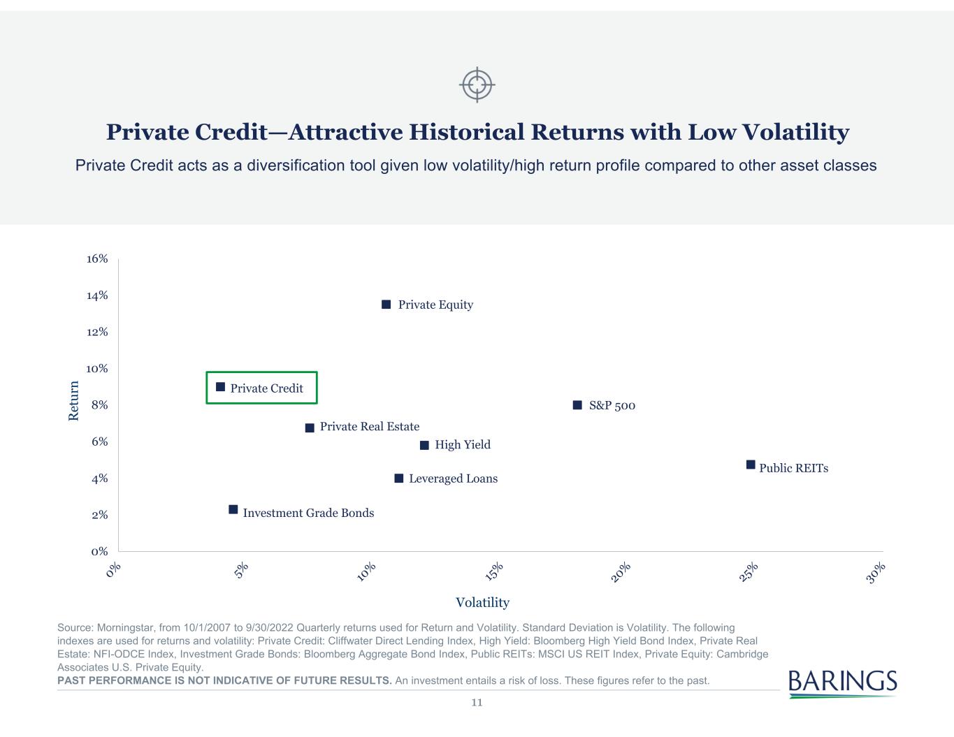11 Private Credit—Attractive Historical Returns with Low Volatility Private Credit acts as a diversification tool given low volatility/high return profile compared to other asset classes Private Credit Private Equity Private Real Estate Investment Grade Bonds Leveraged Loans High Yield S&P 500 Public REITs 0% 2% 4% 6% 8% 10% 12% 14% 16% R et ur n Volatility Source: Morningstar, from 10/1/2007 to 9/30/2022 Quarterly returns used for Return and Volatility. Standard Deviation is Volatility. The following indexes are used for returns and volatility: Private Credit: Cliffwater Direct Lending Index, High Yield: Bloomberg High Yield Bond Index, Private Real Estate: NFI-ODCE Index, Investment Grade Bonds: Bloomberg Aggregate Bond Index, Public REITs: MSCI US REIT Index, Private Equity: Cambridge Associates U.S. Private Equity. PAST PERFORMANCE IS NOT INDICATIVE OF FUTURE RESULTS. An investment entails a risk of loss. These figures refer to the past.