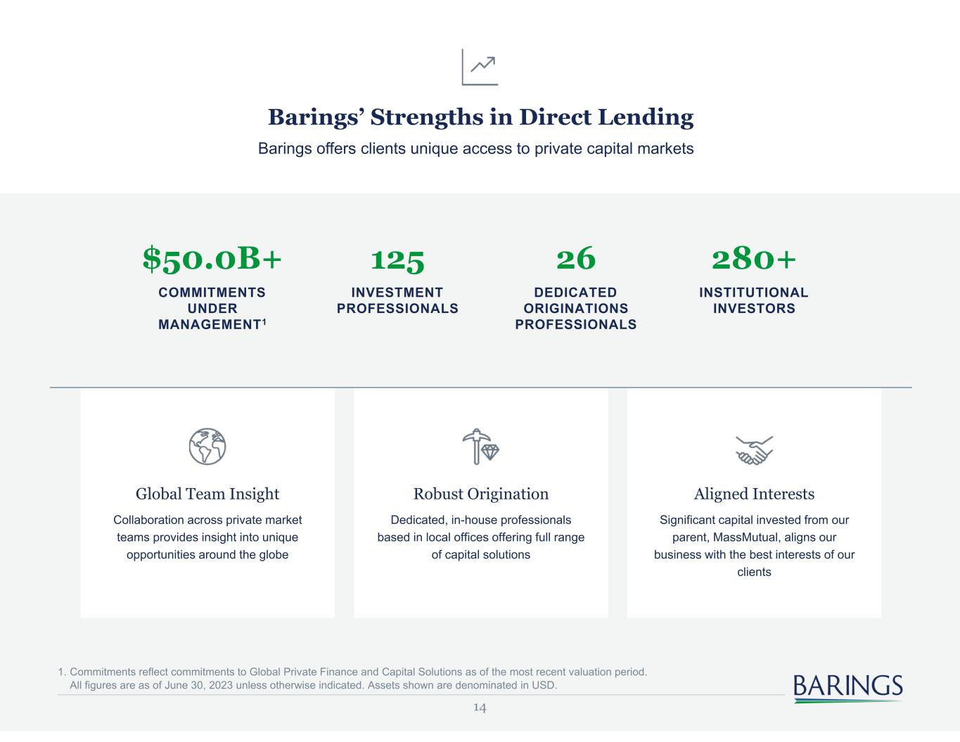 13 What is it? Financing the operating companies of issuers Owned by Private Equity firms Assets are Directly Originated by the Barings team through proprietary relationships with leading Private Equity firms through the United States and Europe What is it? Financing the Operating Companies of issuers irrespective of ownership. Leverages Barings brand and scale to source optimal risk adjusted return in upper middle market and opportunistic middle market transactions Targeted Investment Strategy Mix Sponsor Backed Investments Non-Sponsored Investments Platform Investments What is it? BDC investments in two originators of uncorrelated middle market first-lien loans Barings BDC Franchise Private credit expertise delivering comprehensive exposure to the Middle Market with a focus on first lien loans and securities Typical Terms • <50% Loan to Value • Maintenance Covenants • EBITDA between $15 and $75 Typical Terms • <50% Loan to Value • Maintenance Covenants • EBITDA between $25 and $150 Typical Terms • LTV < 80% of Liquidation Value • Floating Rate • Highly diversified underlying loan exposures The above is being shown for illustrative purposes only. 75-85% 5-15% 5-10%