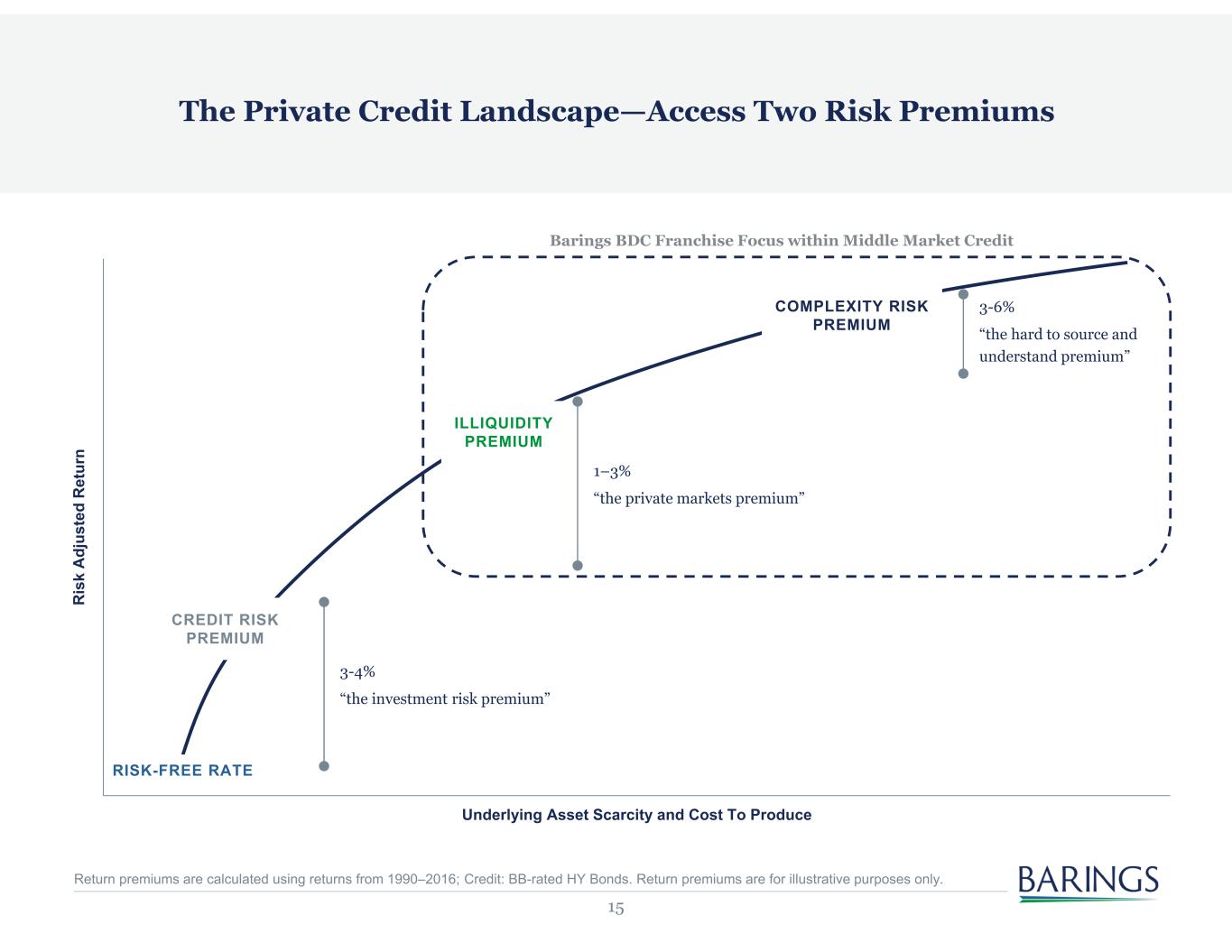 15 CREDIT RISK PREMIUM ILLIQUIDITY PREMIUM COMPLEXITY RISK PREMIUM RISK-FREE RATE 3-4% “the investment risk premium” R is k A dj us te d R et ur n Underlying Asset Scarcity and Cost To Produce Barings BDC Franchise Focus within Middle Market Credit The Private Credit Landscape—Access Two Risk Premiums 1–3% “the private markets premium” 3-6% “the hard to source and understand premium” Return premiums are calculated using returns from 1990–2016; Credit: BB-rated HY Bonds. Return premiums are for illustrative purposes only.