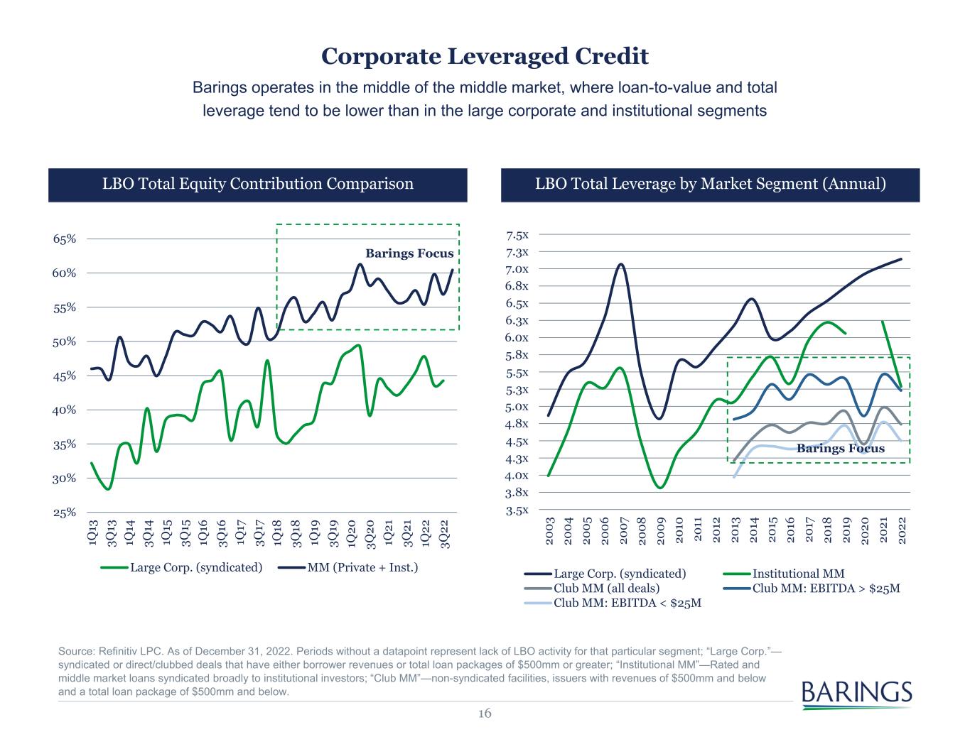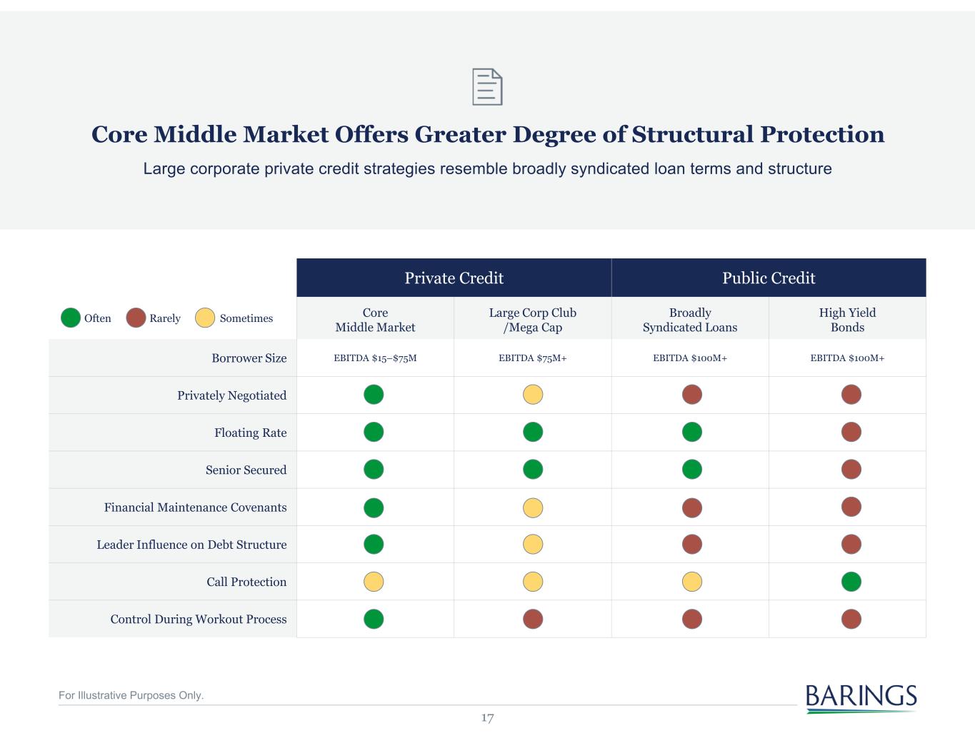 16 Source: Refinitiv LPC. As of December 31, 2022. Periods without a datapoint represent lack of LBO activity for that particular segment; “Large Corp.”— syndicated or direct/clubbed deals that have either borrower revenues or total loan packages of $500mm or greater; “Institutional MM”—Rated and middle market loans syndicated broadly to institutional investors; “Club MM”—non-syndicated facilities, issuers with revenues of $500mm and below and a total loan package of $500mm and below. Corporate Leveraged Credit Barings operates in the middle of the middle market, where loan-to-value and total leverage tend to be lower than in the large corporate and institutional segments LBO Total Equity Contribution Comparison LBO Total Leverage by Market Segment (Annual) 25% 30% 35% 40% 45% 50% 55% 60% 65% 1Q 13 3Q 13 1Q 14 3Q 14 1Q 15 3Q 15 1Q 16 3Q 16 1Q 17 3Q 17 1Q 18 3Q 18 1Q 19 3Q 19 1Q 20 3Q 20 1Q 21 3Q 21 1Q 22 3Q 22 Large Corp. (syndicated) MM (Private + Inst.) 3.5x 3.8x 4.0x 4.3x 4.5x 4.8x 5.0x 5.3x 5.5x 5.8x 6.0x 6.3x 6.5x 6.8x 7.0x 7.3x 7.5x 20 03 20 04 20 05 20 06 20 07 20 08 20 09 20 10 20 11 20 12 20 13 20 14 20 15 20 16 20 17 20 18 20 19 20 20 20 21 20 22 Large Corp. (syndicated) Institutional MM Club MM (all deals) Club MM: EBITDA > $25M Club MM: EBITDA < $25M Barings Focus Barings Focus