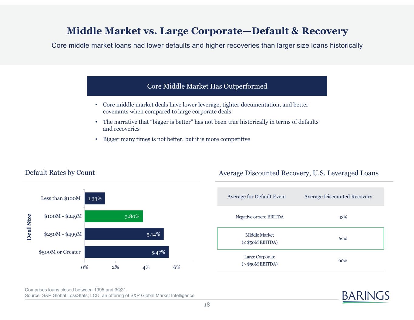17 Large corporate private credit strategies resemble broadly syndicated loan terms and structure Core Middle Market Offers Greater Degree of Structural Protection Private Credit Public Credit Core Middle Market Large Corp Club /Mega Cap Broadly Syndicated Loans High Yield Bonds Borrower Size EBITDA $15–$75M EBITDA $75M+ EBITDA $100M+ EBITDA $100M+ Privately Negotiated Floating Rate Senior Secured Financial Maintenance Covenants Leader Influence on Debt Structure Call Protection Control During Workout Process Often Rarely Sometimes For Illustrative Purposes Only.