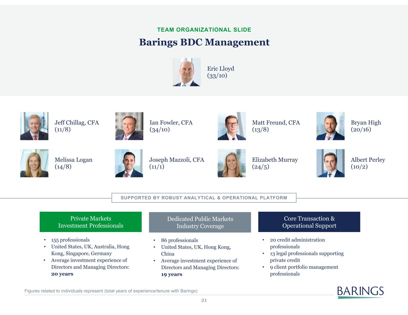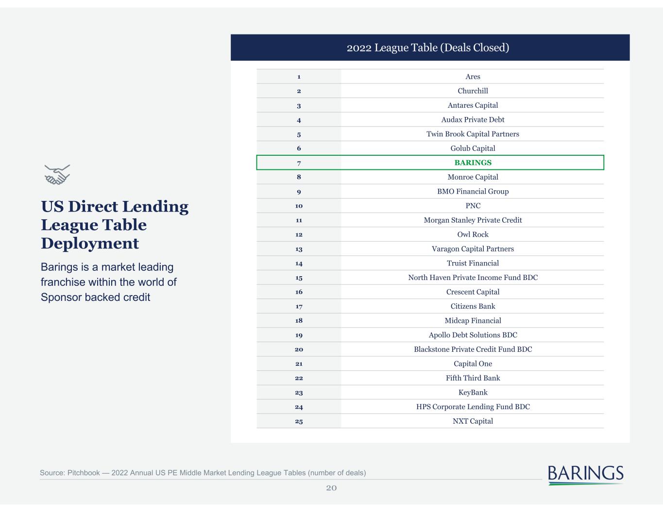20 2022 League Table (Deals Closed) US Direct Lending League Table Deployment 1 Ares 2 Churchill 3 Antares Capital 4 Audax Private Debt 5 Twin Brook Capital Partners 6 Golub Capital 7 BARINGS 8 Monroe Capital 9 BMO Financial Group 10 PNC 11 Morgan Stanley Private Credit 12 Owl Rock 13 Varagon Capital Partners 14 Truist Financial 15 North Haven Private Income Fund BDC 16 Crescent Capital 17 Citizens Bank 18 Midcap Financial 19 Apollo Debt Solutions BDC 20 Blackstone Private Credit Fund BDC 21 Capital One 22 Fifth Third Bank 23 KeyBank 24 HPS Corporate Lending Fund BDC 25 NXT Capital Barings is a market leading franchise within the world of Sponsor backed credit Source: Pitchbook — 2022 Annual US PE Middle Market Lending League Tables (number of deals)
