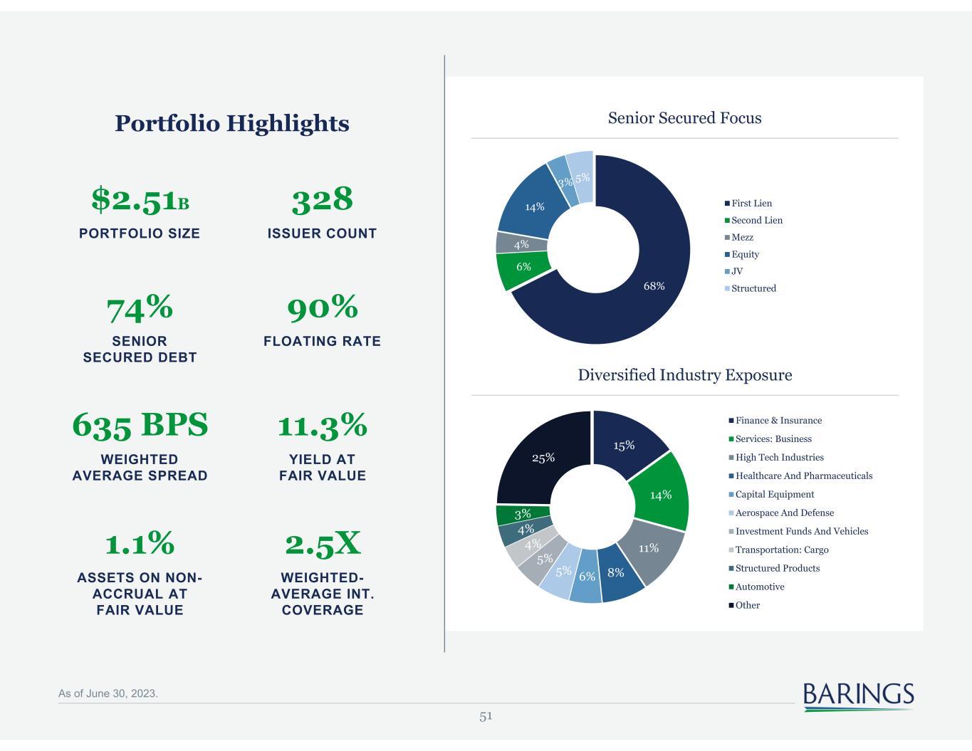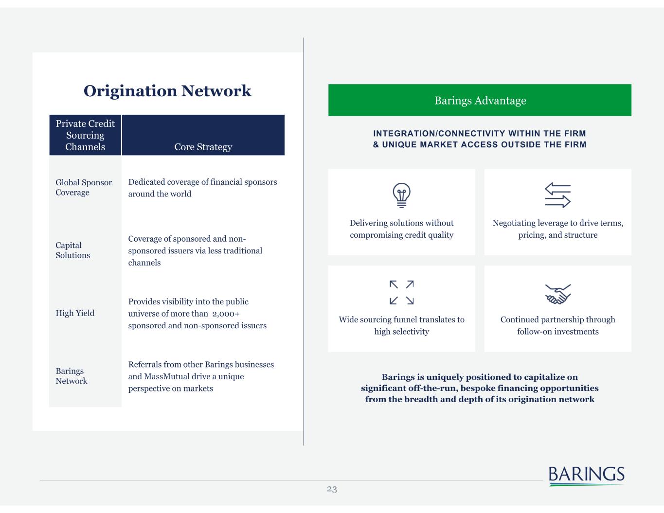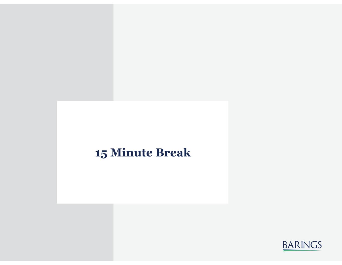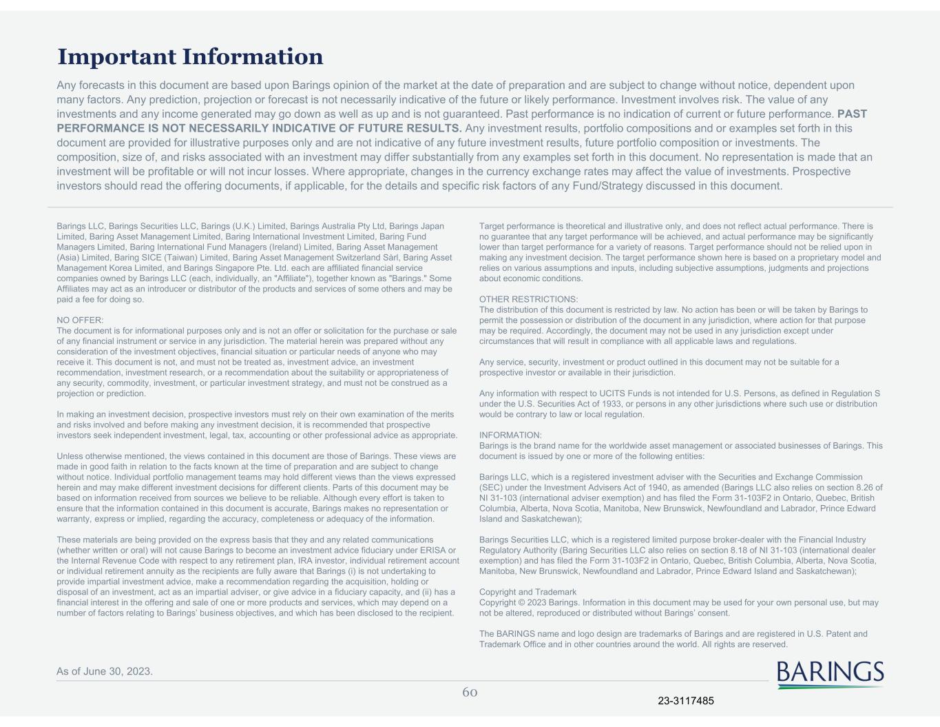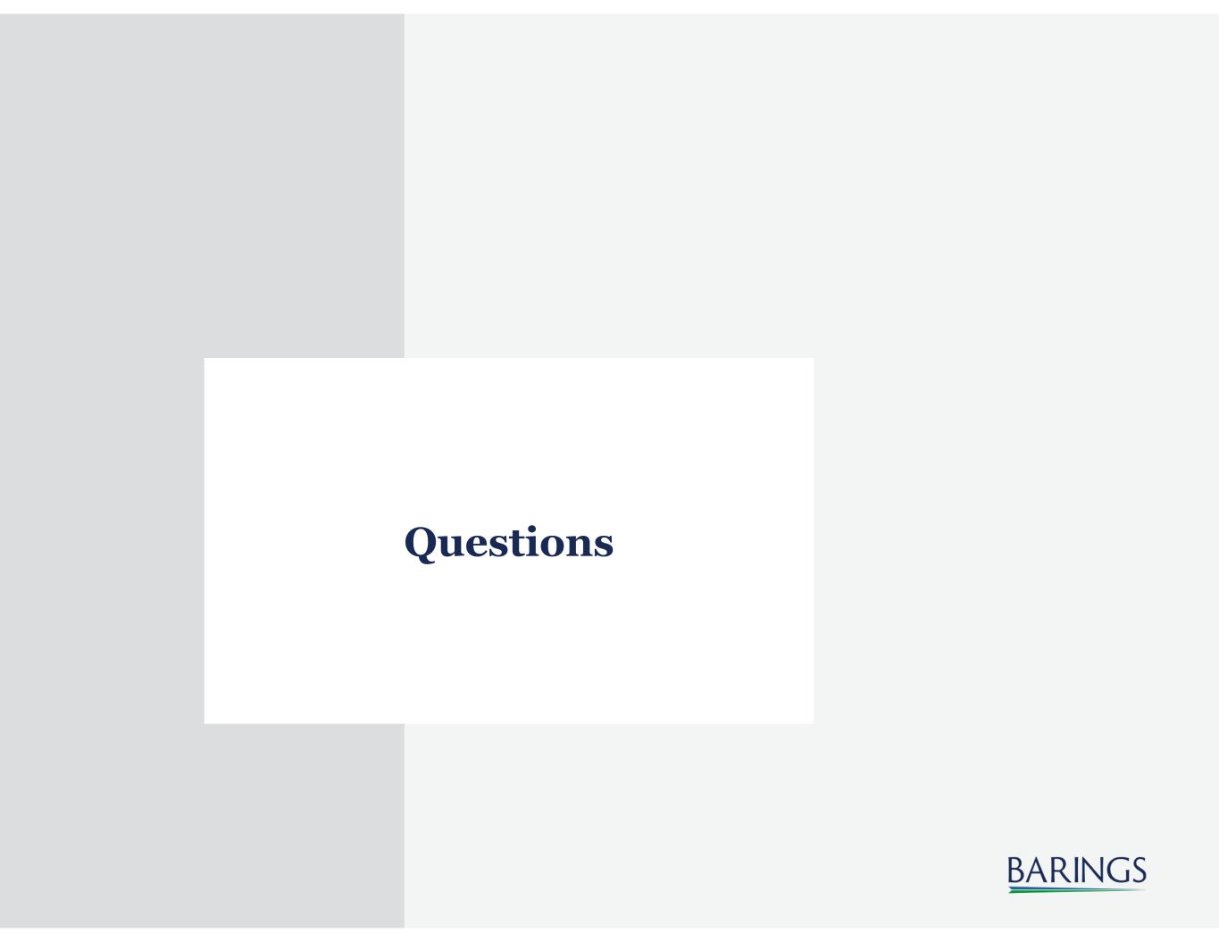 60 Important Information As of June 30, 2023. Barings LLC, Barings Securities LLC, Barings (U.K.) Limited, Barings Australia Pty Ltd, Barings Japan Limited, Baring Asset Management Limited, Baring International Investment Limited, Baring Fund Managers Limited, Baring International Fund Managers (Ireland) Limited, Baring Asset Management (Asia) Limited, Baring SICE (Taiwan) Limited, Baring Asset Management Switzerland Sàrl, Baring Asset Management Korea Limited, and Barings Singapore Pte. Ltd. each are affiliated financial service companies owned by Barings LLC (each, individually, an "Affiliate"), together known as "Barings." Some Affiliates may act as an introducer or distributor of the products and services of some others and may be paid a fee for doing so. NO OFFER: The document is for informational purposes only and is not an offer or solicitation for the purchase or sale of any financial instrument or service in any jurisdiction. The material herein was prepared without any consideration of the investment objectives, financial situation or particular needs of anyone who may receive it. This document is not, and must not be treated as, investment advice, an investment recommendation, investment research, or a recommendation about the suitability or appropriateness of any security, commodity, investment, or particular investment strategy, and must not be construed as a projection or prediction. In making an investment decision, prospective investors must rely on their own examination of the merits and risks involved and before making any investment decision, it is recommended that prospective investors seek independent investment, legal, tax, accounting or other professional advice as appropriate. Unless otherwise mentioned, the views contained in this document are those of Barings. These views are made in good faith in relation to the facts known at the time of preparation and are subject to change without notice. Individual portfolio management teams may hold different views than the views expressed herein and may make different investment decisions for different clients. Parts of this document may be based on information received from sources we believe to be reliable. Although every effort is taken to ensure that the information contained in this document is accurate, Barings makes no representation or warranty, express or implied, regarding the accuracy, completeness or adequacy of the information. These materials are being provided on the express basis that they and any related communications (whether written or oral) will not cause Barings to become an investment advice fiduciary under ERISA or the Internal Revenue Code with respect to any retirement plan, IRA investor, individual retirement account or individual retirement annuity as the recipients are fully aware that Barings (i) is not undertaking to provide impartial investment advice, make a recommendation regarding the acquisition, holding or disposal of an investment, act as an impartial adviser, or give advice in a fiduciary capacity, and (ii) has a financial interest in the offering and sale of one or more products and services, which may depend on a number of factors relating to Barings’ business objectives, and which has been disclosed to the recipient. Any forecasts in this document are based upon Barings opinion of the market at the date of preparation and are subject to change without notice, dependent upon many factors. Any prediction, projection or forecast is not necessarily indicative of the future or likely performance. Investment involves risk. The value of any investments and any income generated may go down as well as up and is not guaranteed. Past performance is no indication of current or future performance. PAST PERFORMANCE IS NOT NECESSARILY INDICATIVE OF FUTURE RESULTS. Any investment results, portfolio compositions and or examples set forth in this document are provided for illustrative purposes only and are not indicative of any future investment results, future portfolio composition or investments. The composition, size of, and risks associated with an investment may differ substantially from any examples set forth in this document. No representation is made that an investment will be profitable or will not incur losses. Where appropriate, changes in the currency exchange rates may affect the value of investments. Prospective investors should read the offering documents, if applicable, for the details and specific risk factors of any Fund/Strategy discussed in this document. Target performance is theoretical and illustrative only, and does not reflect actual performance. There is no guarantee that any target performance will be achieved, and actual performance may be significantly lower than target performance for a variety of reasons. Target performance should not be relied upon in making any investment decision. The target performance shown here is based on a proprietary model and relies on various assumptions and inputs, including subjective assumptions, judgments and projections about economic conditions. OTHER RESTRICTIONS: The distribution of this document is restricted by law. No action has been or will be taken by Barings to permit the possession or distribution of the document in any jurisdiction, where action for that purpose may be required. Accordingly, the document may not be used in any jurisdiction except under circumstances that will result in compliance with all applicable laws and regulations. Any service, security, investment or product outlined in this document may not be suitable for a prospective investor or available in their jurisdiction. Any information with respect to UCITS Funds is not intended for U.S. Persons, as defined in Regulation S under the U.S. Securities Act of 1933, or persons in any other jurisdictions where such use or distribution would be contrary to law or local regulation. INFORMATION: Barings is the brand name for the worldwide asset management or ass