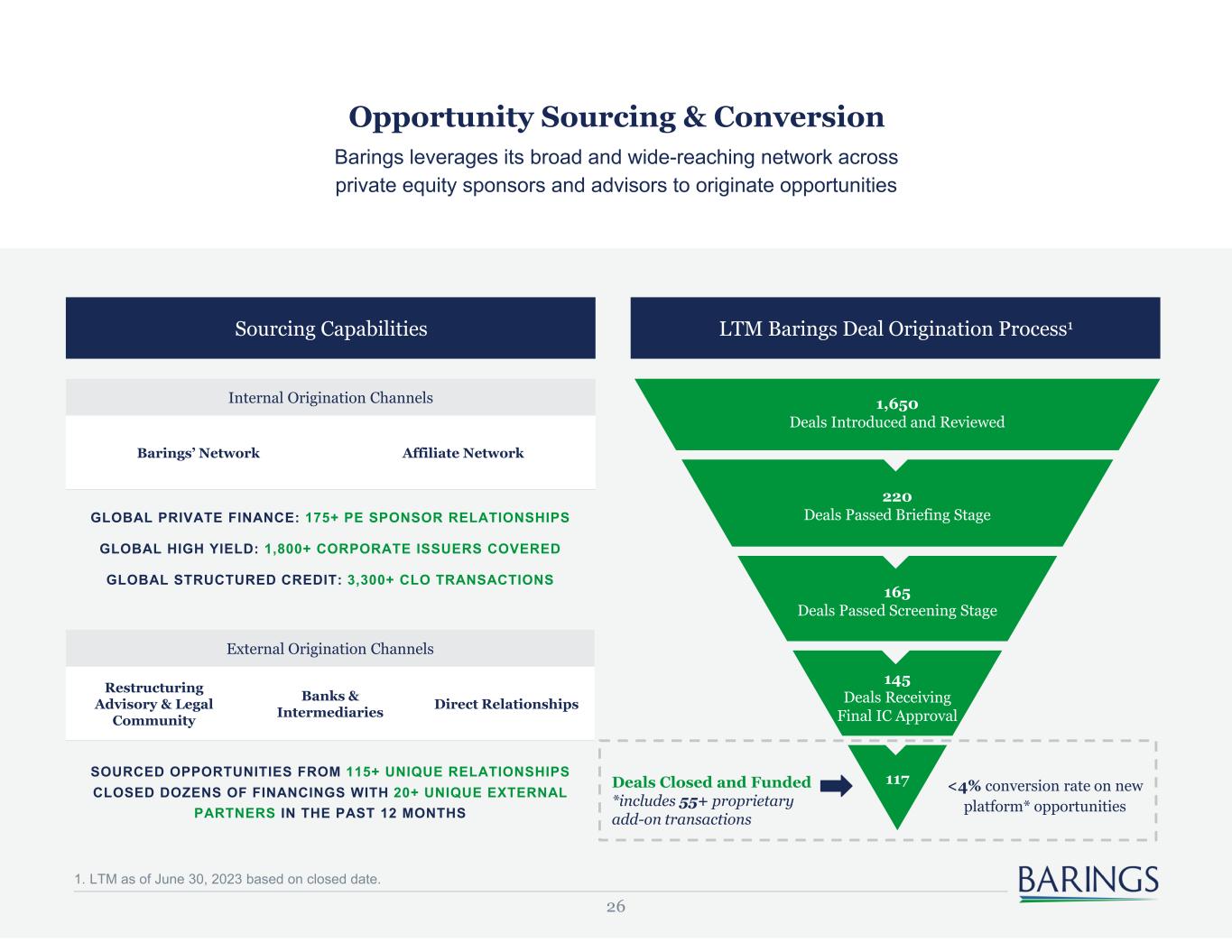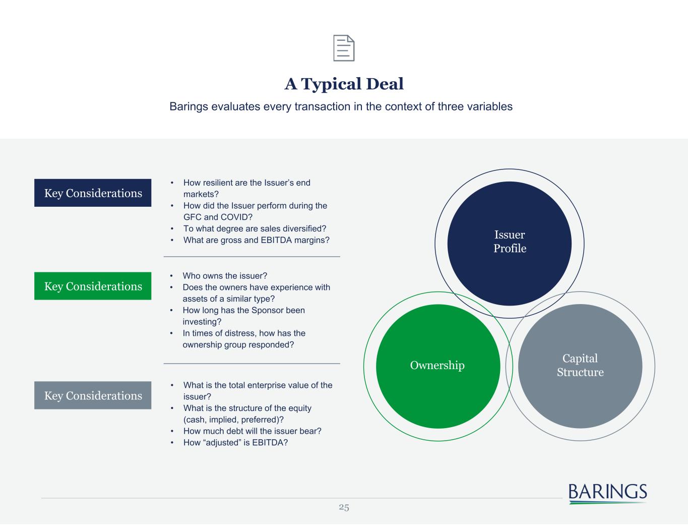 25 Issuer Profile Capital StructureOwnership Key Considerations Key Considerations Key Considerations • What is the total enterprise value of the issuer? • What is the structure of the equity (cash, implied, preferred)? • How much debt will the issuer bear? • How “adjusted” is EBITDA? • How resilient are the Issuer’s end markets? • How did the Issuer perform during the GFC and COVID? • To what degree are sales diversified? • What are gross and EBITDA margins? • Who owns the issuer? • Does the owners have experience with assets of a similar type? • How long has the Sponsor been investing? • In times of distress, how has the ownership group responded? Barings evaluates every transaction in the context of three variables A Typical Deal