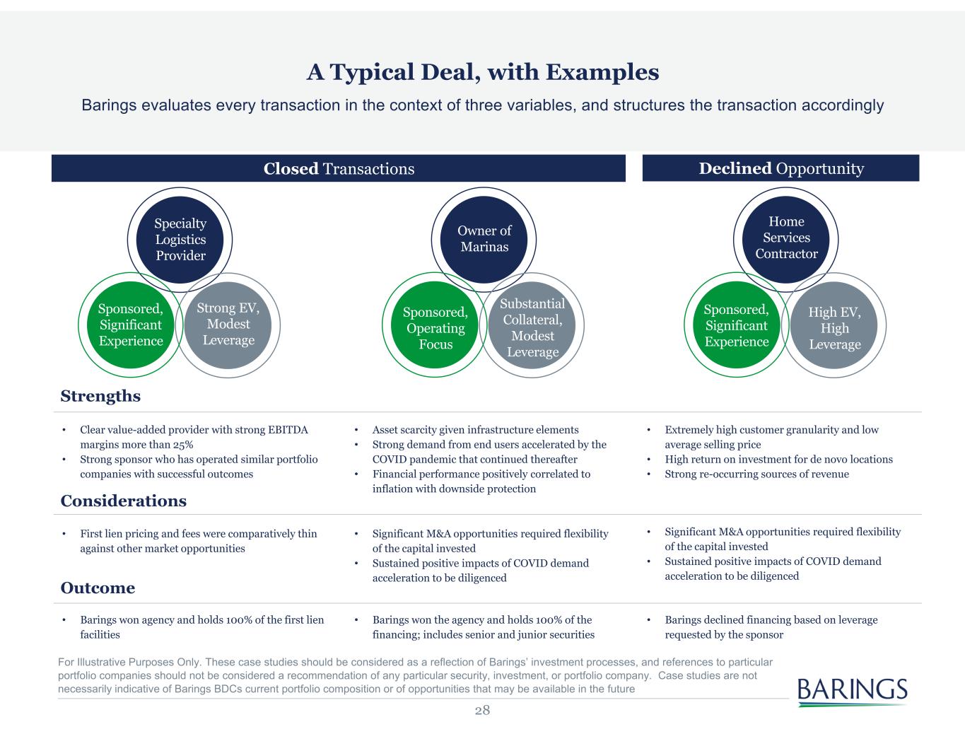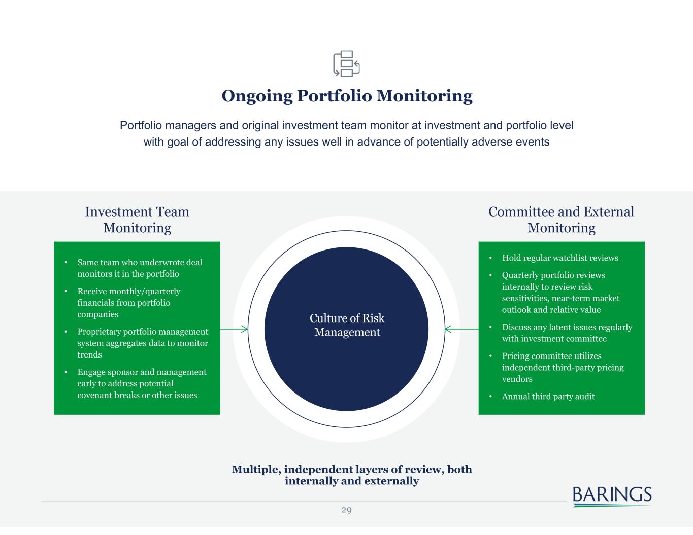 27 Deals Closed & Funded Deals Receive Final IC Approval Deals Passed Screening Stage Investment Process Barings’ Three-Pronged Approach in Practice Issuer Credit Profile Ownership & Governance Capital Structure Introduction & Initial Review Preliminary Review • Inbound received from financial sponsor/issuer • Deal team: MD, Director, Associate Director, Associate/Analyst established Initial Pre Screen • If an opportunity is deemed worthy of further diligence, the investment team performs a high-level review • Fundamental, bottom-up credit analysis • Barings invited to attend management meeting Screening Memo • Memo presented to the investment committee to formally determine whether further diligence should be pursued • Gather independent and third-party research • Build proprietary financial model with base case and downside scenarios • Focus on company fundamentals, sponsor/source, and deal structure Management Meeting • Attend presentation in person • Follow-up call with sponsor post meeting • Opportunity to influence sponsor/issuer view and structure Structure Negotiation • Analyze vendor prepared commercial and financial due diligence • At weekly internal meeting, deal team updates investment committee on deal merits and key diligence issues Deep Dive Due Diligence • Focus on key risks and mitigants • Multiple calls with sponsor and management team • Onsite product diligence; independent research including expert calls • Analysis of buy-side due diligence • Underwriting Memo Final Approval • Consistent diligence threshold and approval criteria globally • Consistent approval process and documents globally • Deals approved at Investment Committee Closing • Documentation finalized • Deal team works with internal Barings finance team for funding and settlements • Deal closes