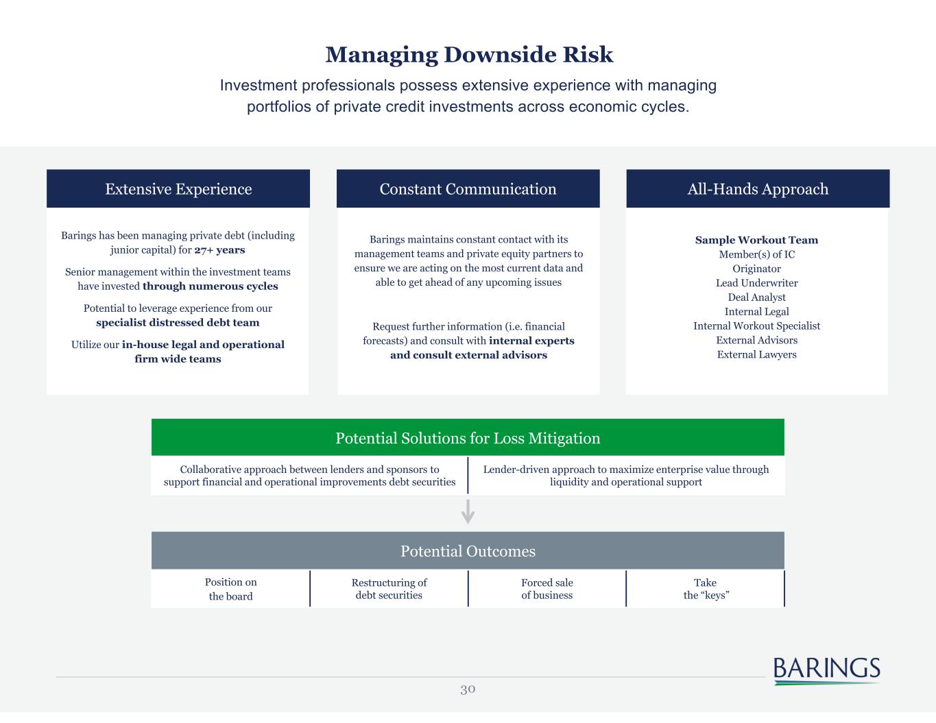 30 Managing Downside Risk Investment professionals possess extensive experience with managing portfolios of private credit investments across economic cycles. Extensive Experience Constant Communication All-Hands Approach Potential Solutions for Loss Mitigation Barings has been managing private debt (including junior capital) for 27+ years Senior management within the investment teams have invested through numerous cycles Potential to leverage experience from our specialist distressed debt team Utilize our in-house legal and operational firm wide teams Barings maintains constant contact with its management teams and private equity partners to ensure we are acting on the most current data and able to get ahead of any upcoming issues Request further information (i.e. financial forecasts) and consult with internal experts and consult external advisors Sample Workout Team Member(s) of IC Originator Lead Underwriter Deal Analyst Internal Legal Internal Workout Specialist External Advisors External Lawyers Potential Outcomes Collaborative approach between lenders and sponsors to support financial and operational improvements debt securities Lender-driven approach to maximize enterprise value through liquidity and operational support Position on the board Restructuring of debt securities Forced sale of business Take the “keys”