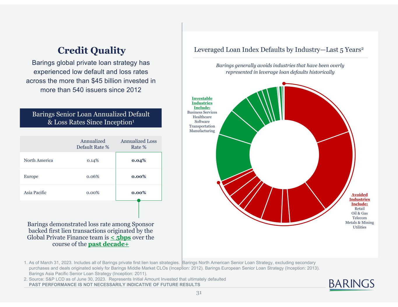 31 Leveraged Loan Index Defaults by Industry—Last 5 Years2Credit Quality Barings global private loan strategy has experienced low default and loss rates across the more than $45 billion invested in more than 540 issuers since 2012 Annualized Default Rate % Annualized Loss Rate % North America 0.14% 0.04% Europe 0.06% 0.00% Asia Pacific 0.00% 0.00% Barings demonstrated loss rate among Sponsor backed first lien transactions originated by the Global Private Finance team is < 5bps over the course of the past decade+ Barings Senior Loan Annualized Default & Loss Rates Since Inception1 Barings generally avoids industries that have been overly represented in leverage loan defaults historically Avoided Industries Include: Retail Oil & Gas Telecom Metals & Mining Utilities Investable Industries Include: Business Services Healthcare Software Transportation Manufacturing 1. As of March 31, 2023. Includes all of Barings private first lien loan strategies. Barings North American Senior Loan Strategy, excluding secondary purchases and deals originated solely for Barings Middle Market CLOs (Inception: 2012). Barings European Senior Loan Strategy (Inception: 2013). Barings Asia Pacific Senior Loan Strategy (Inception: 2011). 2. Source: S&P LCD as of June 30, 2023. Represents Initial Amount Invested that ultimately defaulted PAST PERFORMANCE IS NOT NECESSARILY INDICATIVE OF FUTURE RESULTS
