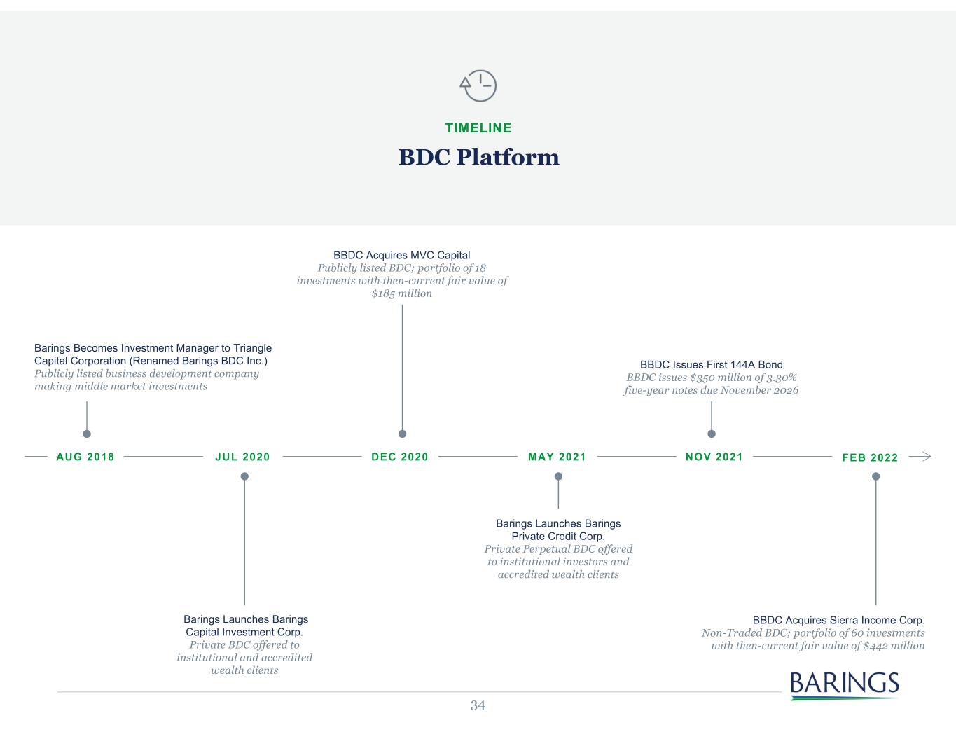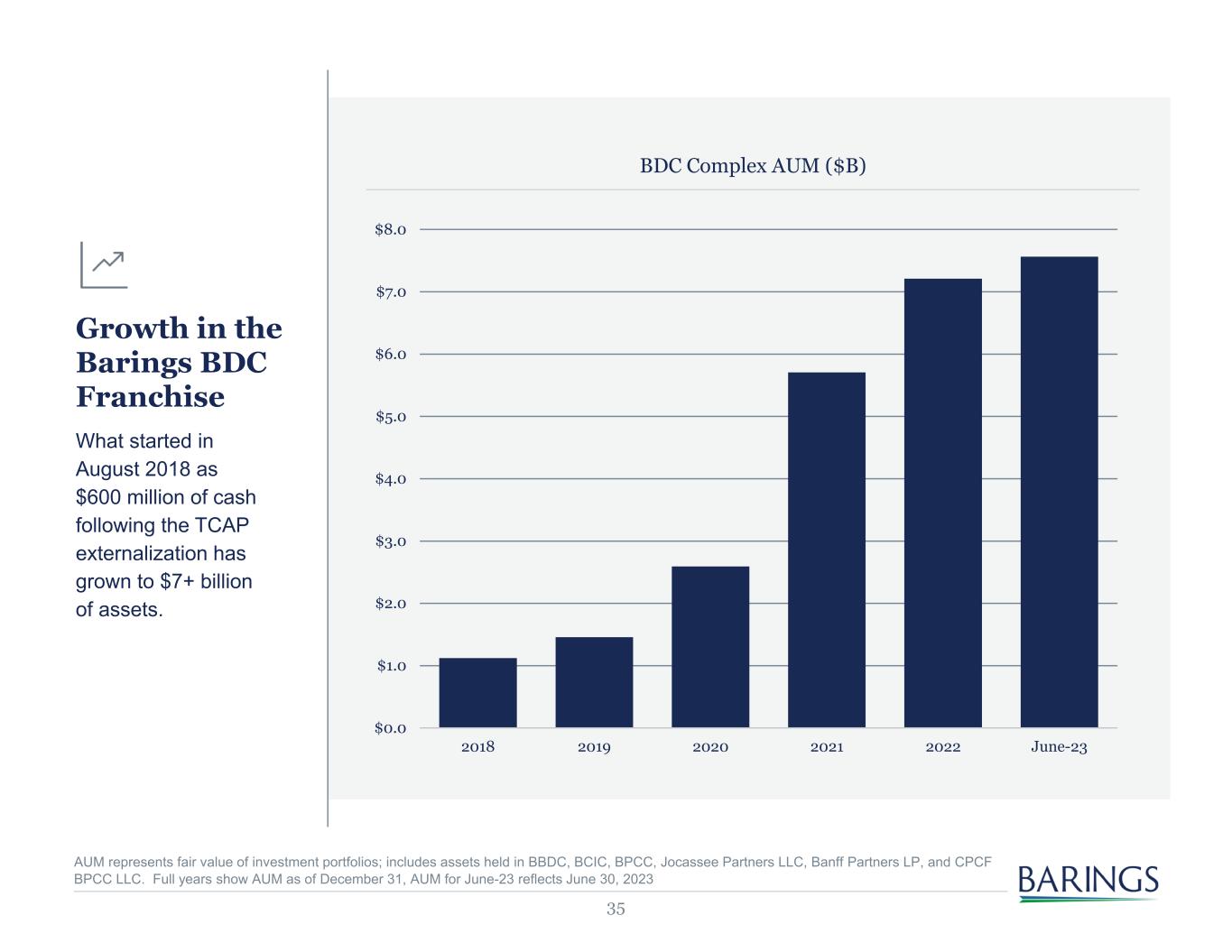 34 BDC Platform TIMELINE AUG 2018 MAY 2021JUL 2020 DEC 2020 Barings Becomes Investment Manager to Triangle Capital Corporation (Renamed Barings BDC Inc.) Publicly listed business development company making middle market investments Barings Launches Barings Private Credit Corp. Private Perpetual BDC offered to institutional investors and accredited wealth clients FEB 2022NOV 2021 BBDC Acquires MVC Capital Publicly listed BDC; portfolio of 18 investments with then-current fair value of $185 million Barings Launches Barings Capital Investment Corp. Private BDC offered to institutional and accredited wealth clients BBDC Issues First 144A Bond BBDC issues $350 million of 3.30% five-year notes due November 2026 BBDC Acquires Sierra Income Corp. Non-Traded BDC; portfolio of 60 investments with then-current fair value of $442 million