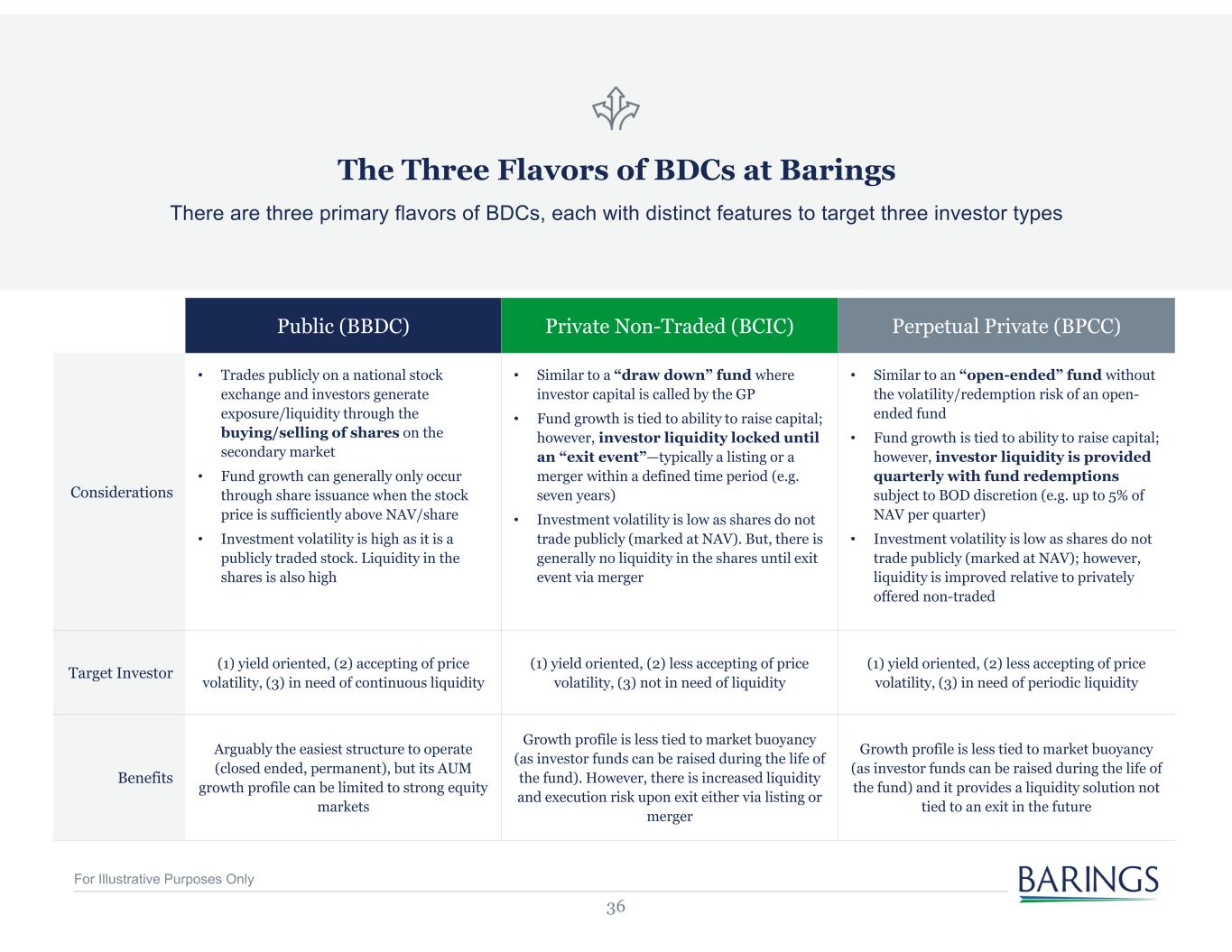 36 There are three primary flavors of BDCs, each with distinct features to target three investor types The Three Flavors of BDCs at Barings Public (BBDC) Private Non-Traded (BCIC) Perpetual Private (BPCC) Considerations • Trades publicly on a national stock exchange and investors generate exposure/liquidity through the buying/selling of shares on the secondary market • Fund growth can generally only occur through share issuance when the stock price is sufficiently above NAV/share • Investment volatility is high as it is a publicly traded stock. Liquidity in the shares is also high • Similar to a “draw down” fund where investor capital is called by the GP • Fund growth is tied to ability to raise capital; however, investor liquidity locked until an “exit event”—typically a listing or a merger within a defined time period (e.g. seven years) • Investment volatility is low as shares do not trade publicly (marked at NAV). But, there is generally no liquidity in the shares until exit event via merger • Similar to an “open-ended” fund without the volatility/redemption risk of an open- ended fund • Fund growth is tied to ability to raise capital; however, investor liquidity is provided quarterly with fund redemptions subject to BOD discretion (e.g. up to 5% of NAV per quarter) • Investment volatility is low as shares do not trade publicly (marked at NAV); however, liquidity is improved relative to privately offered non-traded Target Investor (1) yield oriented, (2) accepting of price volatility, (3) in need of continuous liquidity (1) yield oriented, (2) less accepting of price volatility, (3) not in need of liquidity (1) yield oriented, (2) less accepting of price volatility, (3) in need of periodic liquidity Benefits Arguably the easiest structure to operate (closed ended, permanent), but its AUM growth profile can be limited to strong equity markets Growth profile is less tied to market buoyancy (as investor funds can be raised during the life of the fund). However, there is increased liquidity and execution risk upon exit either via listing or merger Growth profile is less tied to market buoyancy (as investor funds can be raised during the life of the fund) and it provides a liquidity solution not tied to an exit in the future For Illustrative Purposes Only