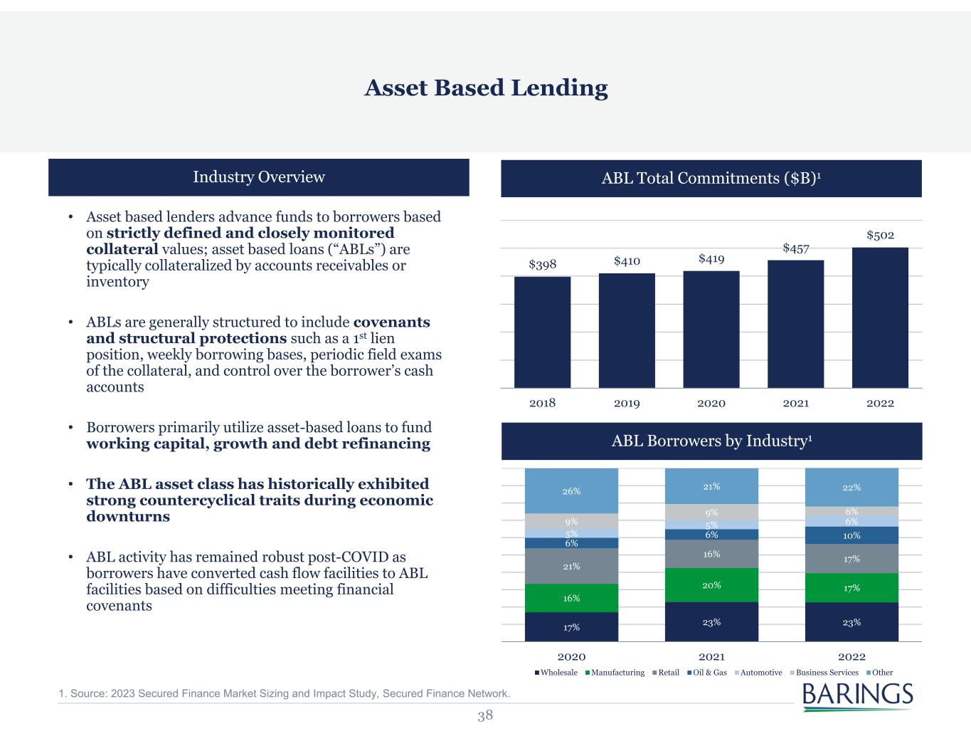 38 $398 $410 $419 $457 $502 2018 2019 2020 2021 2022 Industry Overview • Asset based lenders advance funds to borrowers based on strictly defined and closely monitored collateral values; asset based loans (“ABLs”) are typically collateralized by accounts receivables or inventory • ABLs are generally structured to include covenants and structural protections such as a 1st lien position, weekly borrowing bases, periodic field exams of the collateral, and control over the borrower’s cash accounts • Borrowers primarily utilize asset-based loans to fund working capital, growth and debt refinancing • The ABL asset class has historically exhibited strong countercyclical traits during economic downturns • ABL activity has remained robust post-COVID as borrowers have converted cash flow facilities to ABL facilities based on difficulties meeting financial covenants Asset Based Lending 17% 23% 23% 16% 20% 17% 21% 16% 17% 6% 6% 10%5% 5% 6%9% 9% 6% 26% 21% 22% 2020 2021 2022 Wholesale Manufacturing Retail Oil & Gas Automotive Business Services Other ABL Total Commitments ($B)1 ABL Borrowers by Industry1 1. Source: 2023 Secured Finance Market Sizing and Impact Study, Secured Finance Network.