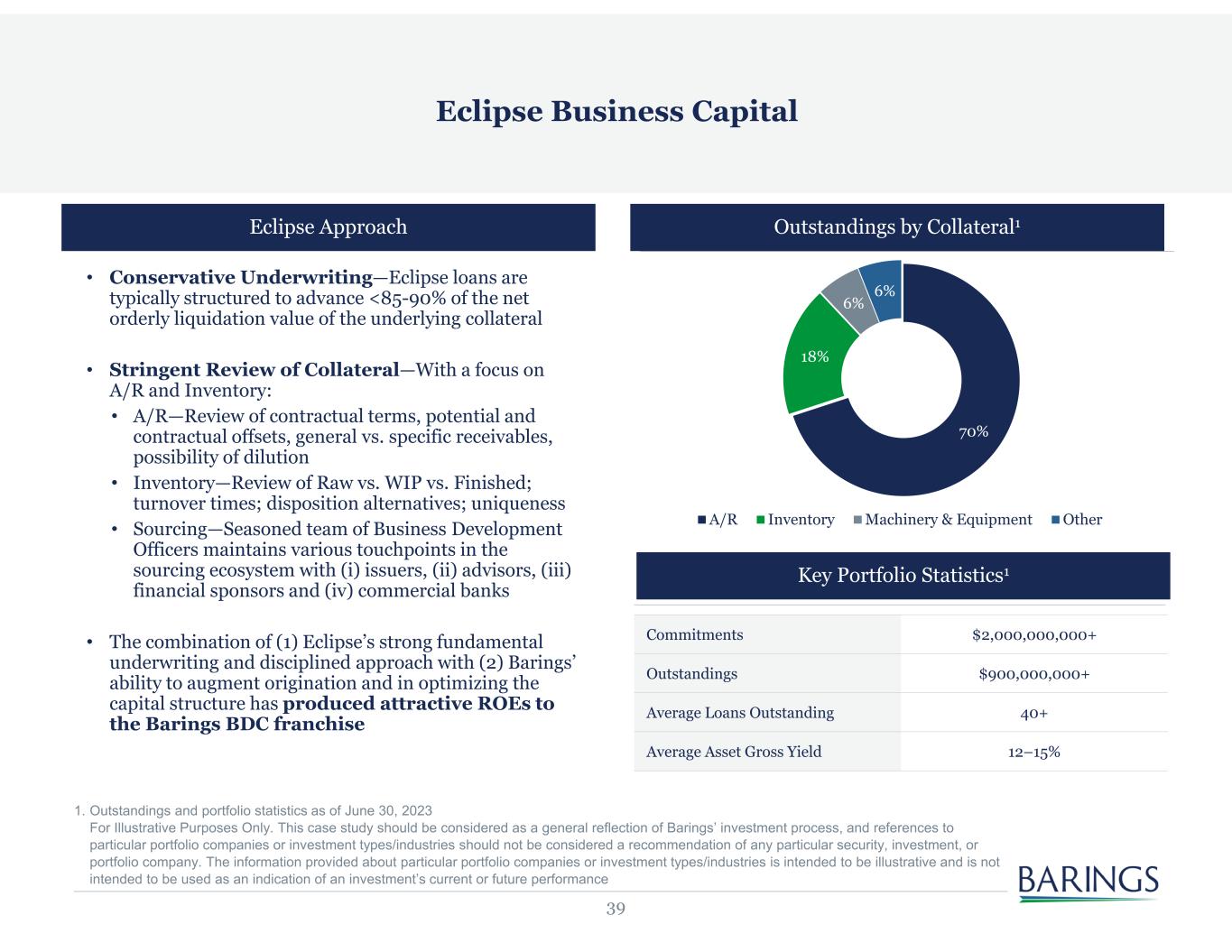 39 Eclipse Approach • Conservative Underwriting—Eclipse loans are typically structured to advance <85-90% of the net orderly liquidation value of the underlying collateral • Stringent Review of Collateral—With a focus on A/R and Inventory: • A/R—Review of contractual terms, potential and contractual offsets, general vs. specific receivables, possibility of dilution • Inventory—Review of Raw vs. WIP vs. Finished; turnover times; disposition alternatives; uniqueness • Sourcing—Seasoned team of Business Development Officers maintains various touchpoints in the sourcing ecosystem with (i) issuers, (ii) advisors, (iii) financial sponsors and (iv) commercial banks • The combination of (1) Eclipse’s strong fundamental underwriting and disciplined approach with (2) Barings’ ability to augment origination and in optimizing the capital structure has produced attractive ROEs to the Barings BDC franchise Commitments $2,000,000,000+ Outstandings $900,000,000+ Average Loans Outstanding 40+ Average Asset Gross Yield 12–15% Eclipse Business Capital 70% 18% 6% 6% A/R Inventory Machinery & Equipment Other Key Portfolio Statistics1 Outstandings by Collateral1 1. Outstandings and portfolio statistics as of June 30, 2023 For Illustrative Purposes Only. This case study should be considered as a general reflection of Barings’ investment process, and references to particular portfolio companies or investment types/industries should not be considered a recommendation of any particular security, investment, or portfolio company. The information provided about particular portfolio companies or investment types/industries is intended to be illustrative and is not intended to be used as an indication of an investment’s current or future performance