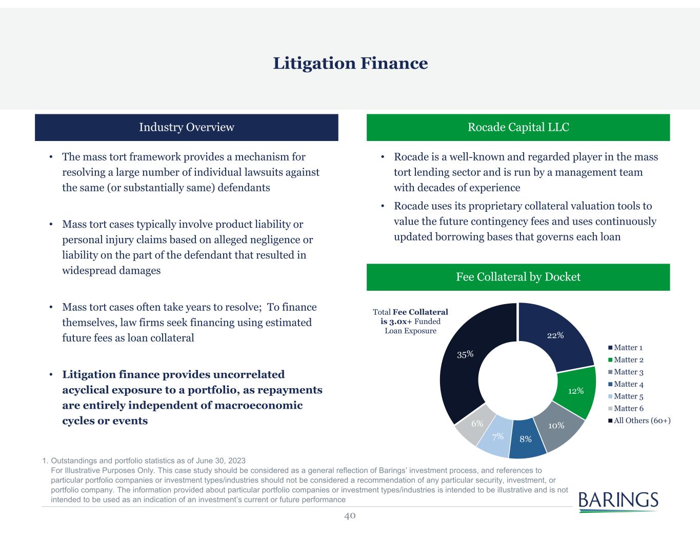 40 Industry Overview • The mass tort framework provides a mechanism for resolving a large number of individual lawsuits against the same (or substantially same) defendants • Mass tort cases typically involve product liability or personal injury claims based on alleged negligence or liability on the part of the defendant that resulted in widespread damages • Mass tort cases often take years to resolve; To finance themselves, law firms seek financing using estimated future fees as loan collateral • Litigation finance provides uncorrelated acyclical exposure to a portfolio, as repayments are entirely independent of macroeconomic cycles or events Litigation Finance Rocade Capital LLC • Rocade is a well-known and regarded player in the mass tort lending sector and is run by a management team with decades of experience • Rocade uses its proprietary collateral valuation tools to value the future contingency fees and uses continuously updated borrowing bases that governs each loan 22% 12% 10% 8%7% 6% 35% Matter 1 Matter 2 Matter 3 Matter 4 Matter 5 Matter 6 All Others (60+) Total Fee Collateral is 3.0x+ Funded Loan Exposure Fee Collateral by Docket 1. Outstandings and portfolio statistics as of June 30, 2023 For Illustrative Purposes Only. This case study should be considered as a general reflection of Barings’ investment process, and references to particular portfolio companies or investment types/industries should not be considered a recommendation of any particular security, investment, or portfolio company. The information provided about particular portfolio companies or investment types/industries is intended to be illustrative and is not intended to be used as an indication of an investment’s current or future performance
