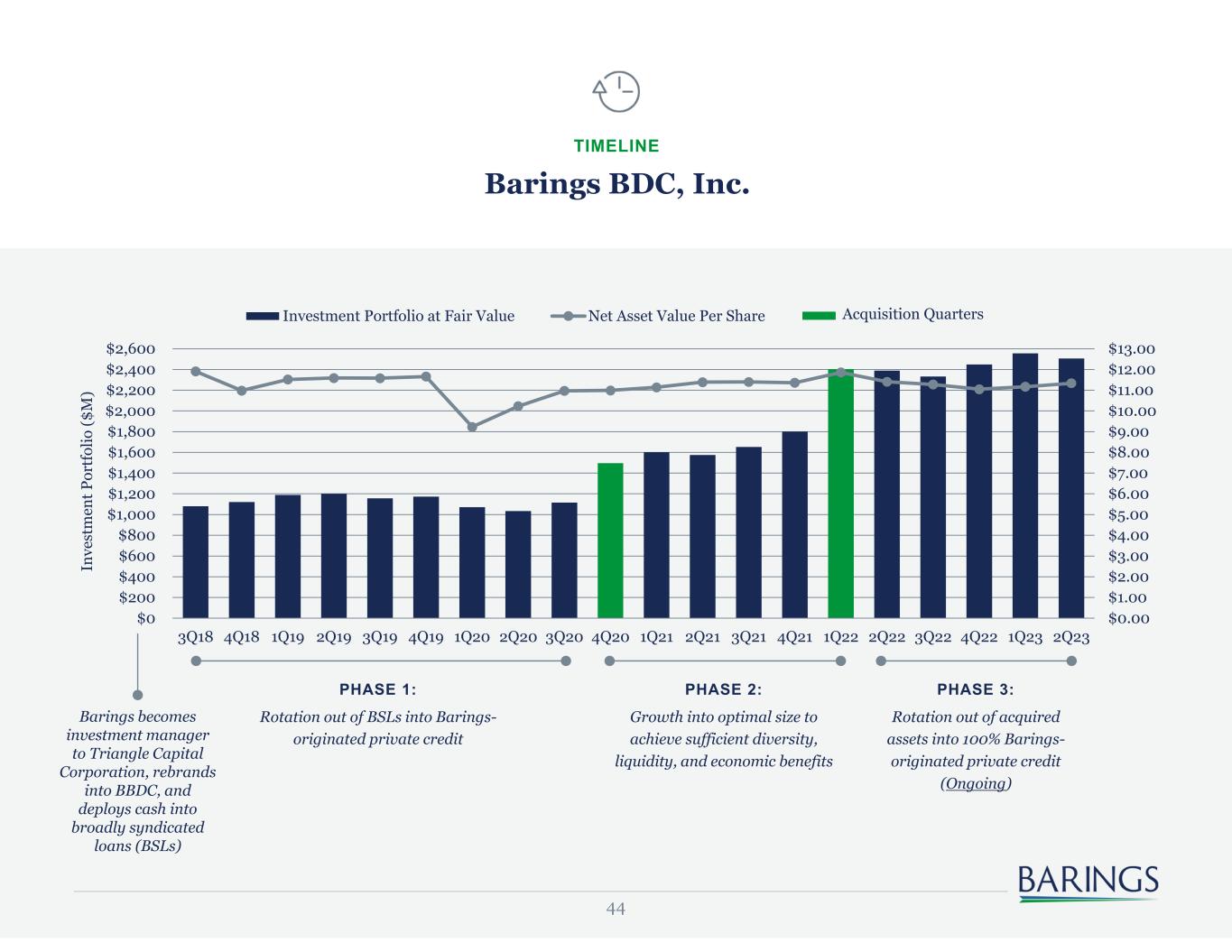 44 Barings BDC, Inc. TIMELINE Barings becomes investment manager to Triangle Capital Corporation, rebrands into BBDC, and deploys cash into broadly syndicated loans (BSLs) PHASE 1: Rotation out of BSLs into Barings- originated private credit $0.00 $1.00 $2.00 $3.00 $4.00 $5.00 $6.00 $7.00 $8.00 $9.00 $10.00 $11.00 $12.00 $13.00 $0 $200 $400 $600 $800 $1,000 $1,200 $1,400 $1,600 $1,800 $2,000 $2,200 $2,400 $2,600 3Q18 4Q18 1Q19 2Q19 3Q19 4Q19 1Q20 2Q20 3Q20 4Q20 1Q21 2Q21 3Q21 4Q21 1Q22 2Q22 3Q22 4Q22 1Q23 2Q23 In ve st m en t P or tf ol io ($ M ) Investment Portfolio at Fair Value Net Asset Value Per Share Acquisition Quarters PHASE 2: Growth into optimal size to achieve sufficient diversity, liquidity, and economic benefits PHASE 3: Rotation out of acquired assets into 100% Barings- originated private credit (Ongoing)