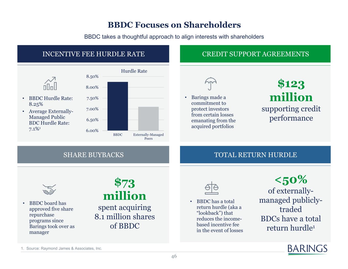 45 • Since the externalization in August of 2018, the board of directors has approved five separate share repurchase plans • The acquisitions of MVC and Sierra Income were accompanied with share repurchase plans of $15 million and $30 million, respectively • Share repurchases have been executed in 11 of 12 quarters where BBDC was not subject to a transaction blackout • BBDC has spent over $73 million buying back 8.1 million shares BBDC Equity Price Since Externalization $0.00 $2.00 $4.00 $6.00 $8.00 $10.00 $12.00 $14.00 Sh ar e Pr ic e ($ ) February 2019 BBDC begins share repurchases February 2023 BBDC announces new $30mm share repurchase plan commencing on March 1, 2023 February 2020 BBDC announces new share repurchase plan for fiscal year 2020 May 2021 BBDC begins new $15mm share repurchase plan following MVC acquisition April 2022 BBDC commences new $30mm share repurchase plan following SIC acquisition BBDC Share Repurchase Program Barings believes share repurchases can play an important role in our long-term capital allocation philosophy “Barings has a track record of announcing share repurchase programs and actually using them.” Robert Dodd, Raymond James1 1. This testimonial was given by a person other than a current client or investor. Cash or non-cash compensation was not provided for the testimonial. Appears in Barings BDC, Inc. research report published by Raymond James & Associates, Inc. on August 10, 2023. Raymond James & Associates, Inc. makes a market in the shares of Barings BDC, Inc.