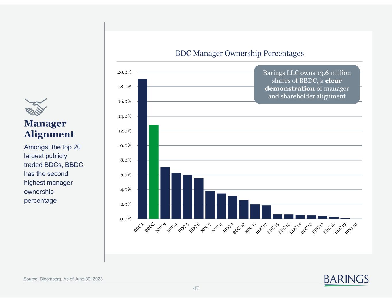 47 Source: Bloomberg. As of June 30, 2023. Manager Alignment Amongst the top 20 largest publicly traded BDCs, BBDC has the second highest manager ownership percentage BDC Manager Ownership Percentages 0.0% 2.0% 4.0% 6.0% 8.0% 10.0% 12.0% 14.0% 16.0% 18.0% 20.0% Barings LLC owns 13.6 million shares of BBDC, a clear demonstration of manager and shareholder alignment