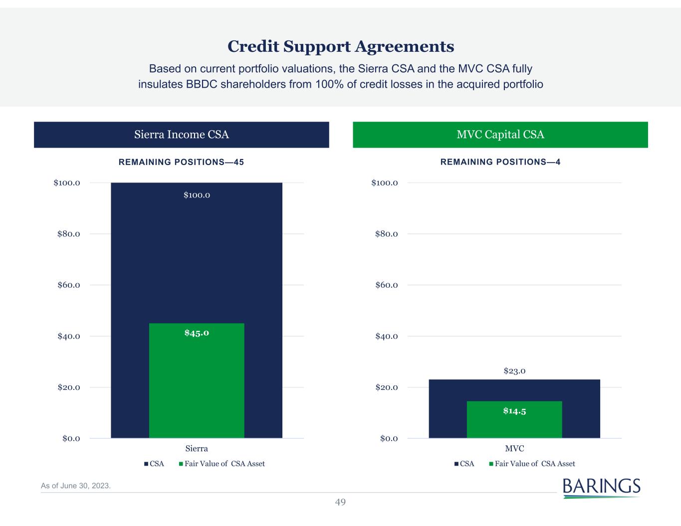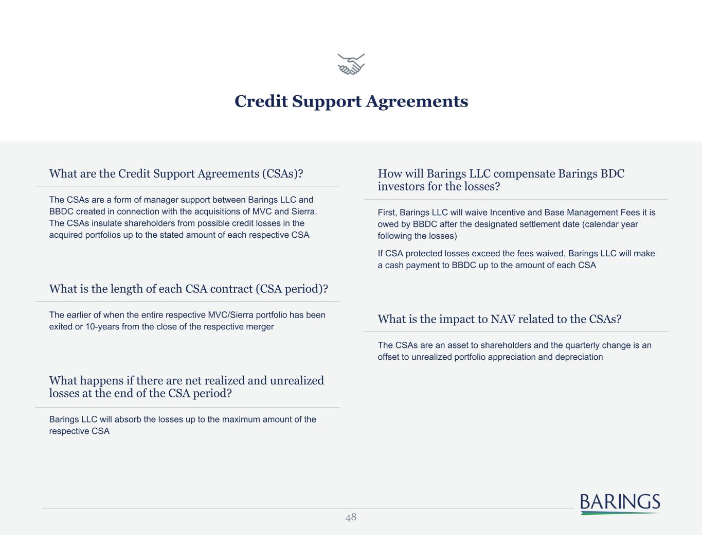 48 Credit Support Agreements What are the Credit Support Agreements (CSAs)? The CSAs are a form of manager support between Barings LLC and BBDC created in connection with the acquisitions of MVC and Sierra. The CSAs insulate shareholders from possible credit losses in the acquired portfolios up to the stated amount of each respective CSA What is the length of each CSA contract (CSA period)? The earlier of when the entire respective MVC/Sierra portfolio has been exited or 10-years from the close of the respective merger What happens if there are net realized and unrealized losses at the end of the CSA period? Barings LLC will absorb the losses up to the maximum amount of the respective CSA How will Barings LLC compensate Barings BDC investors for the losses? First, Barings LLC will waive Incentive and Base Management Fees it is owed by BBDC after the designated settlement date (calendar year following the losses) If CSA protected losses exceed the fees waived, Barings LLC will make a cash payment to BBDC up to the amount of each CSA What is the impact to NAV related to the CSAs? The CSAs are an asset to shareholders and the quarterly change is an offset to unrealized portfolio appreciation and depreciation