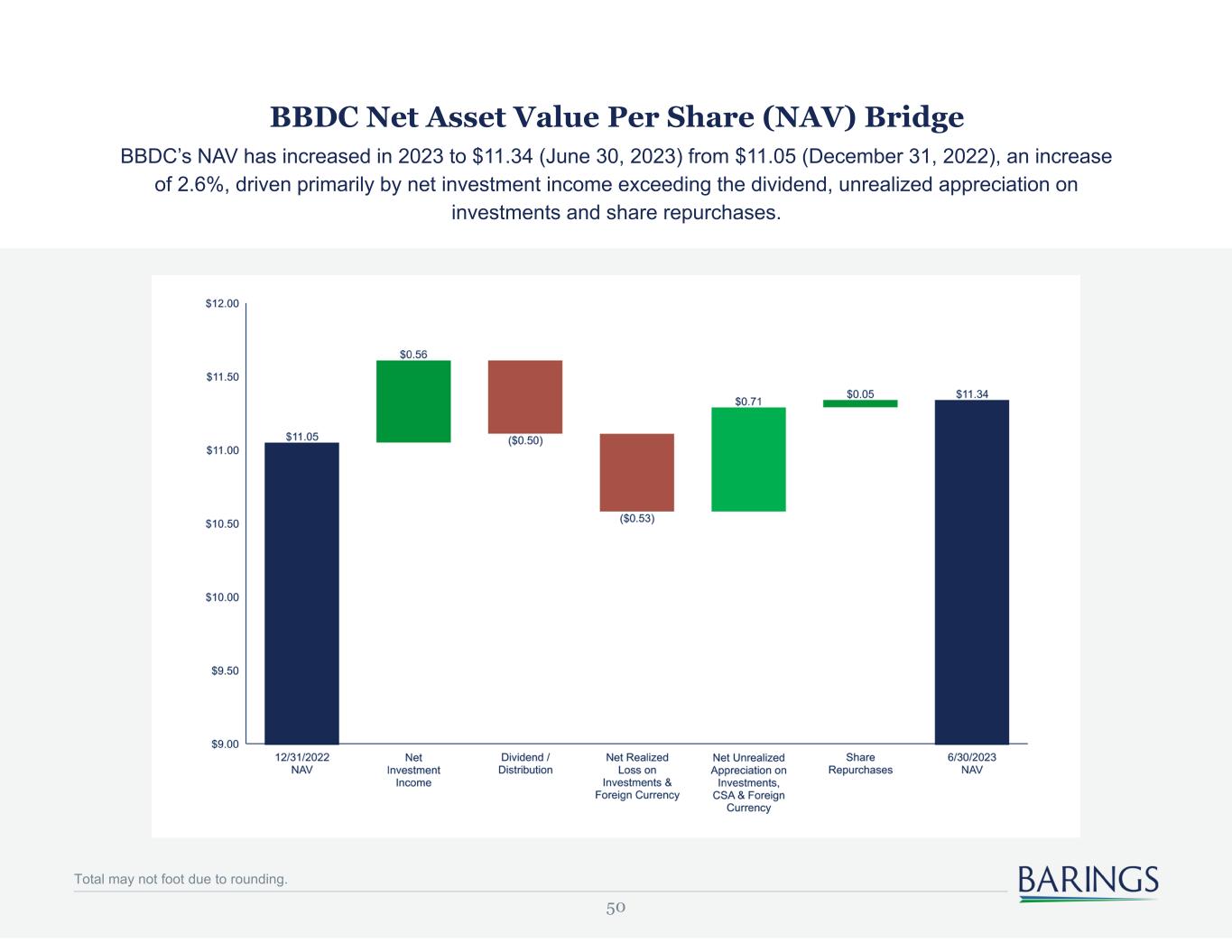 50 BBDC Net Asset Value Per Share (NAV) Bridge BBDC’s NAV has increased in 2023 to $11.34 (June 30, 2023) from $11.05 (December 31, 2022), an increase of 2.6%, driven primarily by net investment income exceeding the dividend, unrealized appreciation on investments and share repurchases. Total may not foot due to rounding.