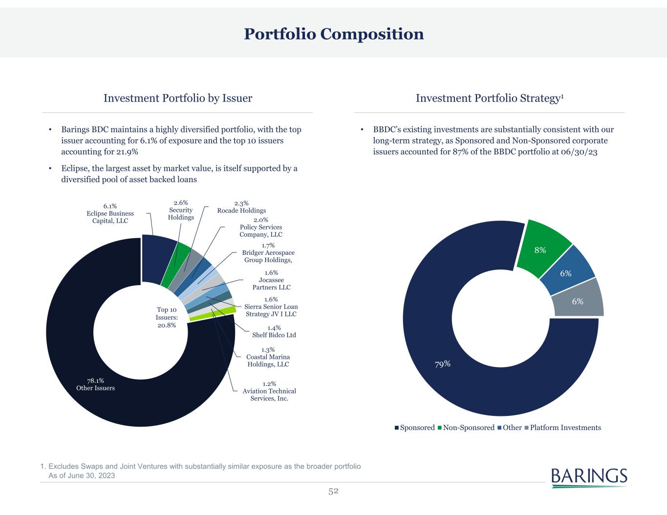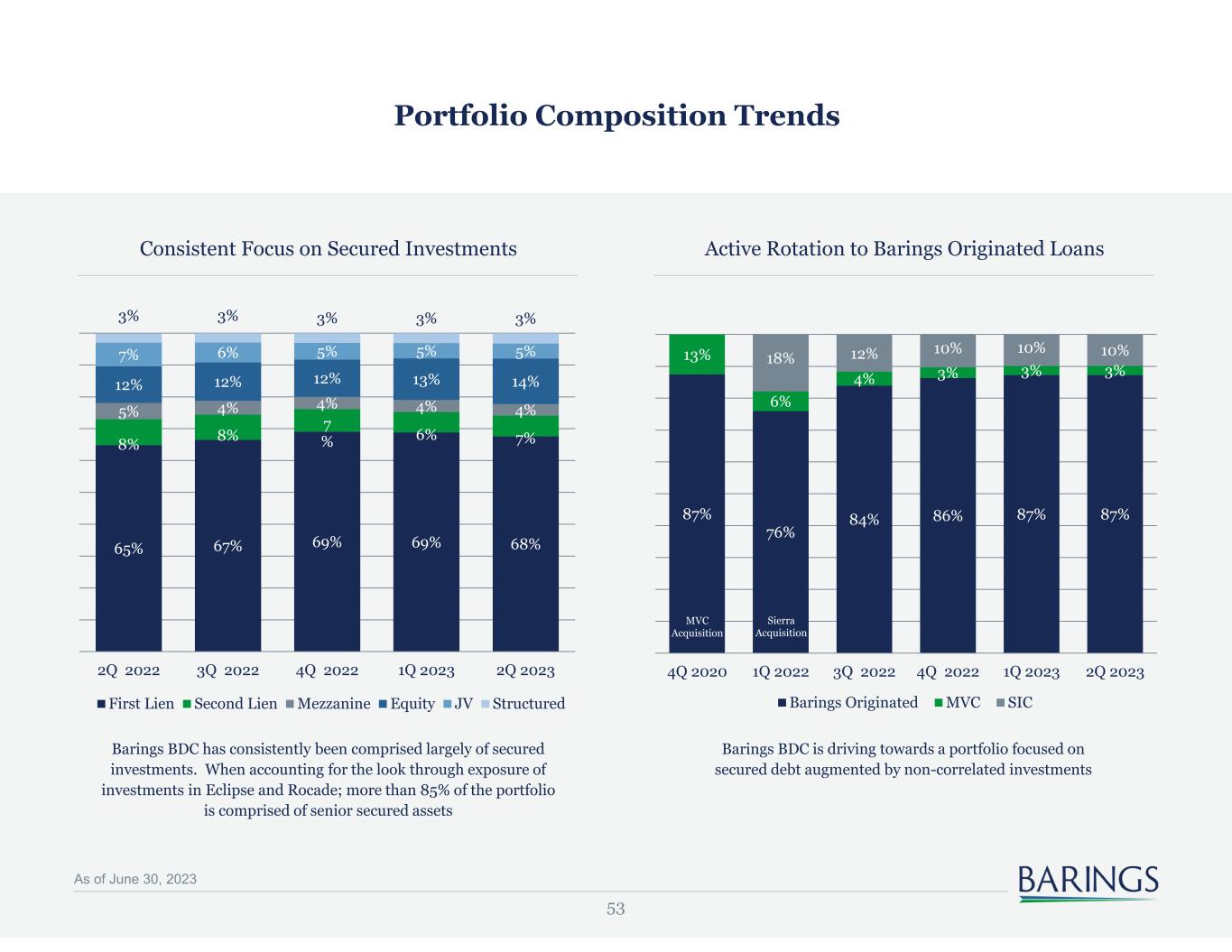 52 Portfolio Composition Investment Portfolio by Issuer • Barings BDC maintains a highly diversified portfolio, with the top issuer accounting for 6.1% of exposure and the top 10 issuers accounting for 21.9% • Eclipse, the largest asset by market value, is itself supported by a diversified pool of asset backed loans 6.1% Eclipse Business Capital, LLC 2.6% Security Holdings 2.3% Rocade Holdings 2.0% Policy Services Company, LLC 1.7% Bridger Aerospace Group Holdings, 1.6% Jocassee Partners LLC 1.6% Sierra Senior Loan Strategy JV I LLC 1.4% Shelf Bidco Ltd 1.3% Coastal Marina Holdings, LLC 1.2% Aviation Technical Services, Inc. 78.1% Other Issuers Top 10 Issuers: 20.8% Investment Portfolio Strategy1 • BBDC’s existing investments are substantially consistent with our long-term strategy, as Sponsored and Non-Sponsored corporate issuers accounted for 87% of the BBDC portfolio at 06/30/23 1. Excludes Swaps and Joint Ventures with substantially similar exposure as the broader portfolio As of June 30, 2023 79% 8% 6% 6% Sponsored Non-Sponsored Other Platform Investments