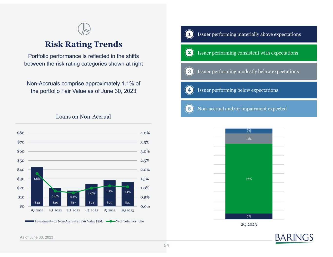 53 Portfolio Composition Trends Consistent Focus on Secured Investments Barings BDC has consistently been comprised largely of secured investments. When accounting for the look through exposure of investments in Eclipse and Rocade; more than 85% of the portfolio is comprised of senior secured assets Active Rotation to Barings Originated Loans Barings BDC is driving towards a portfolio focused on secured debt augmented by non-correlated investments 87% 76% 84% 86% 87% 87% 13% 6% 4% 3% 3% 3% 18% 12% 10% 10% 10% 4Q 2020 1Q 2022 3Q 2022 4Q 2022 1Q 2023 2Q 2023 Barings Originated MVC SIC MVC Acquisition Sierra Acquisition 65% 67% 69% 69% 68% 8% 8% 7 % 6% 7% 5% 4% 4% 4% 4% 12% 12% 12% 13% 14% 7% 6% 5% 5% 5% 3% 3% 3% 3% 3% 2Q 2022 3Q 2022 4Q 2022 1Q 2023 2Q 2023 First Lien Second Lien Mezzanine Equity JV Structured As of June 30, 2023