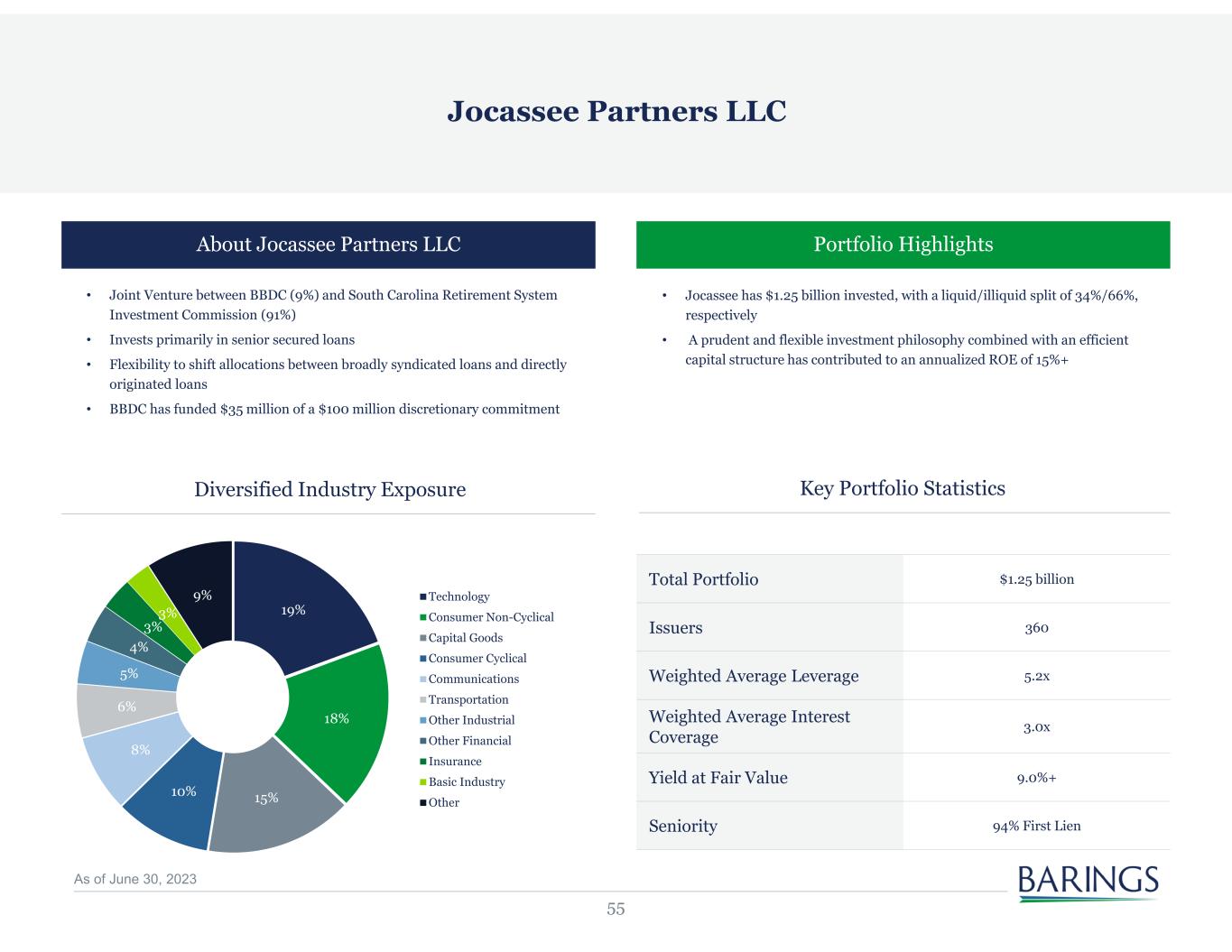 55 Portfolio HighlightsAbout Jocassee Partners LLC • Jocassee has $1.25 billion invested, with a liquid/illiquid split of 34%/66%, respectively • A prudent and flexible investment philosophy combined with an efficient capital structure has contributed to an annualized ROE of 15%+ Key Portfolio StatisticsDiversified Industry Exposure • Joint Venture between BBDC (9%) and South Carolina Retirement System Investment Commission (91%) • Invests primarily in senior secured loans • Flexibility to shift allocations between broadly syndicated loans and directly originated loans • BBDC has funded $35 million of a $100 million discretionary commitment Total Portfolio $1.25 billion Issuers 360 Weighted Average Leverage 5.2x Weighted Average Interest Coverage 3.0x Yield at Fair Value 9.0%+ Seniority 94% First Lien Jocassee Partners LLC 19% 18% 15%10% 8% 6% 5% 4% 3% 3% 9% Technology Consumer Non-Cyclical Capital Goods Consumer Cyclical Communications Transportation Other Industrial Other Financial Insurance Basic Industry Other As of June 30, 2023