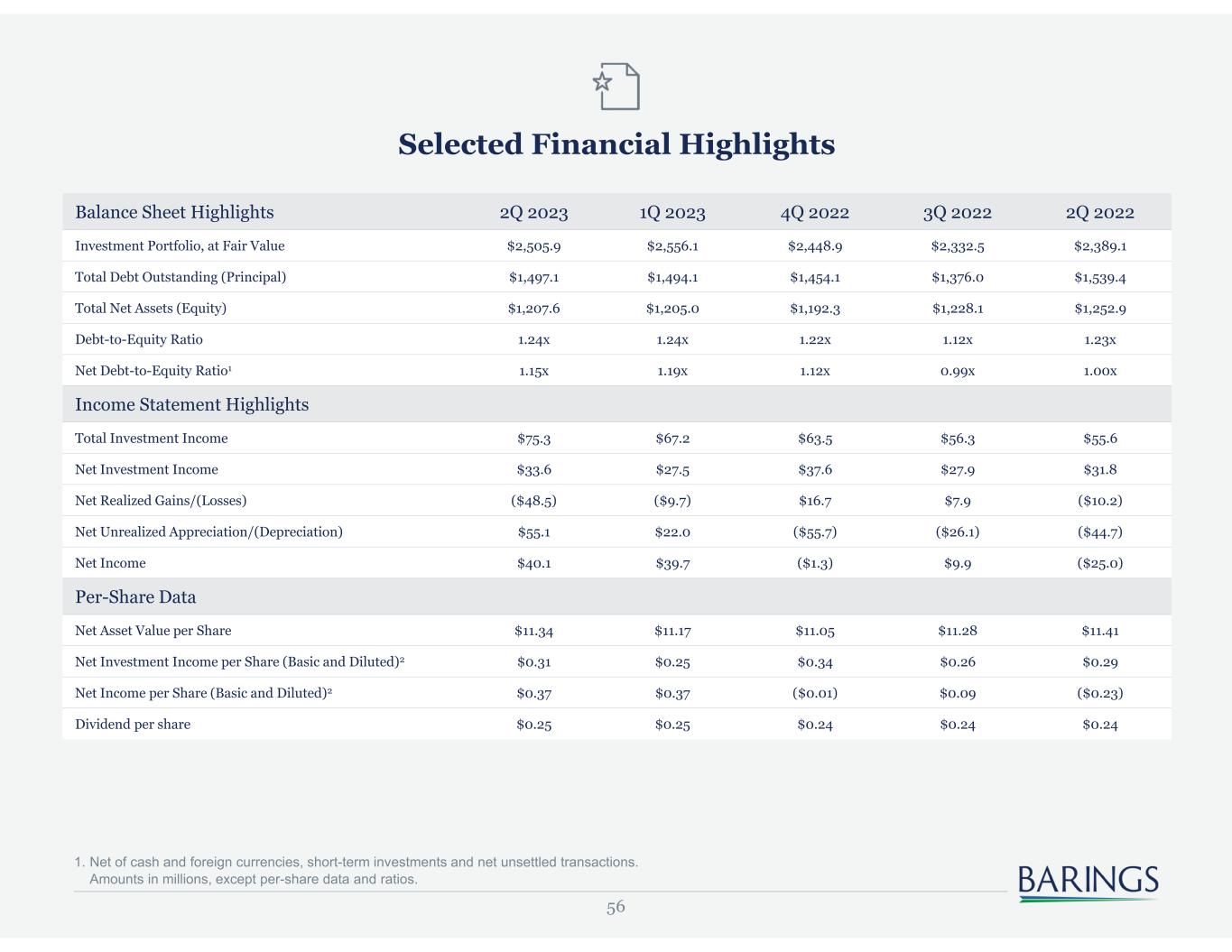 56 Selected Financial Highlights 1. Net of cash and foreign currencies, short-term investments and net unsettled transactions. Amounts in millions, except per-share data and ratios. Balance Sheet Highlights 2Q 2023 1Q 2023 4Q 2022 3Q 2022 2Q 2022 Investment Portfolio, at Fair Value $2,505.9 $2,556.1 $2,448.9 $2,332.5 $2,389.1 Total Debt Outstanding (Principal) $1,497.1 $1,494.1 $1,454.1 $1,376.0 $1,539.4 Total Net Assets (Equity) $1,207.6 $1,205.0 $1,192.3 $1,228.1 $1,252.9 Debt-to-Equity Ratio 1.24x 1.24x 1.22x 1.12x 1.23x Net Debt-to-Equity Ratio1 1.15x 1.19x 1.12x 0.99x 1.00x Income Statement Highlights Total Investment Income $75.3 $67.2 $63.5 $56.3 $55.6 Net Investment Income $33.6 $27.5 $37.6 $27.9 $31.8 Net Realized Gains/(Losses) ($48.5) ($9.7) $16.7 $7.9 ($10.2) Net Unrealized Appreciation/(Depreciation) $55.1 $22.0 ($55.7) ($26.1) ($44.7) Net Income $40.1 $39.7 ($1.3) $9.9 ($25.0) Per-Share Data Net Asset Value per Share $11.34 $11.17 $11.05 $11.28 $11.41 Net Investment Income per Share (Basic and Diluted)2 $0.31 $0.25 $0.34 $0.26 $0.29 Net Income per Share (Basic and Diluted)2 $0.37 $0.37 ($0.01) $0.09 ($0.23) Dividend per share $0.25 $0.25 $0.24 $0.24 $0.24
