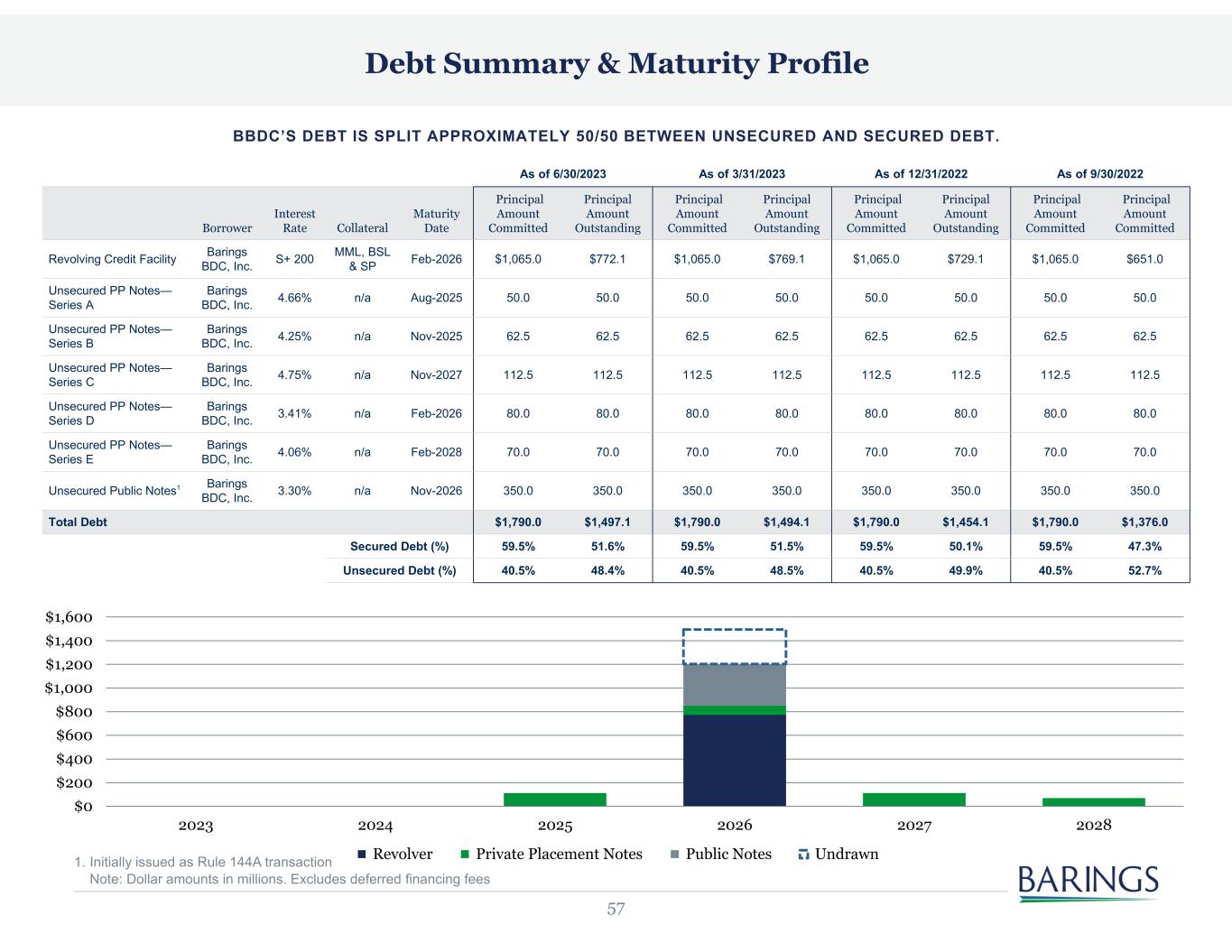 57 Debt Summary & Maturity Profile 1. Initially issued as Rule 144A transaction Note: Dollar amounts in millions. Excludes deferred financing fees BBDC’S DEBT IS SPLIT APPROXIMATELY 50/50 BETWEEN UNSECURED AND SECURED DEBT. As of 6/30/2023 As of 3/31/2023 As of 12/31/2022 As of 9/30/2022 Borrower Interest Rate Collateral Maturity Date Principal Amount Committed Principal Amount Outstanding Principal Amount Committed Principal Amount Outstanding Principal Amount Committed Principal Amount Outstanding Principal Amount Committed Principal Amount Committed Revolving Credit Facility Barings BDC, Inc. S+ 200 MML, BSL & SP Feb-2026 $1,065.0 $772.1 $1,065.0 $769.1 $1,065.0 $729.1 $1,065.0 $651.0 Unsecured PP Notes— Series A Barings BDC, Inc. 4.66% n/a Aug-2025 50.0 50.0 50.0 50.0 50.0 50.0 50.0 50.0 Unsecured PP Notes— Series B Barings BDC, Inc. 4.25% n/a Nov-2025 62.5 62.5 62.5 62.5 62.5 62.5 62.5 62.5 Unsecured PP Notes— Series C Barings BDC, Inc. 4.75% n/a Nov-2027 112.5 112.5 112.5 112.5 112.5 112.5 112.5 112.5 Unsecured PP Notes— Series D Barings BDC, Inc. 3.41% n/a Feb-2026 80.0 80.0 80.0 80.0 80.0 80.0 80.0 80.0 Unsecured PP Notes— Series E Barings BDC, Inc. 4.06% n/a Feb-2028 70.0 70.0 70.0 70.0 70.0 70.0 70.0 70.0 Unsecured Public Notes1 Barings BDC, Inc. 3.30% n/a Nov-2026 350.0 350.0 350.0 350.0 350.0 350.0 350.0 350.0 Total Debt $1,790.0 $1,497.1 $1,790.0 $1,494.1 $1,790.0 $1,454.1 $1,790.0 $1,376.0 Secured Debt (%) 59.5% 51.6% 59.5% 51.5% 59.5% 50.1% 59.5% 47.3% Unsecured Debt (%) 40.5% 48.4% 40.5% 48.5% 40.5% 49.9% 40.5% 52.7% $0 $200 $400 $600 $800 $1,000 $1,200 $1,400 $1,600 2023 2024 2025 2026 2027 2028 Revolver Private Placement Notes Public Notes Undrawn