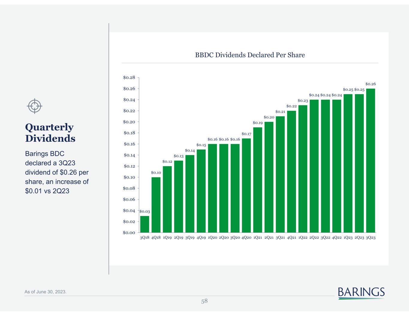 58 As of June 30, 2023. Quarterly Dividends Barings BDC declared a 3Q23 dividend of $0.26 per share, an increase of $0.01 vs 2Q23 BBDC Dividends Declared Per Share $0.03 $0.10 $0.12 $0.13 $0.14 $0.15 $0.16 $0.16 $0.16 $0.17 $0.19 $0.20 $0.21 $0.22 $0.23 $0.24 $0.24 $0.24 $0.25 $0.25 $0.26 $0.00 $0.02 $0.04 $0.06 $0.08 $0.10 $0.12 $0.14 $0.16 $0.18 $0.20 $0.22 $0.24 $0.26 $0.28 3Q18 4Q18 1Q19 2Q19 3Q19 4Q19 1Q20 2Q20 3Q20 4Q20 1Q21 2Q21 3Q21 4Q21 1Q22 2Q22 3Q22 4Q22 1Q23 2Q23 3Q23