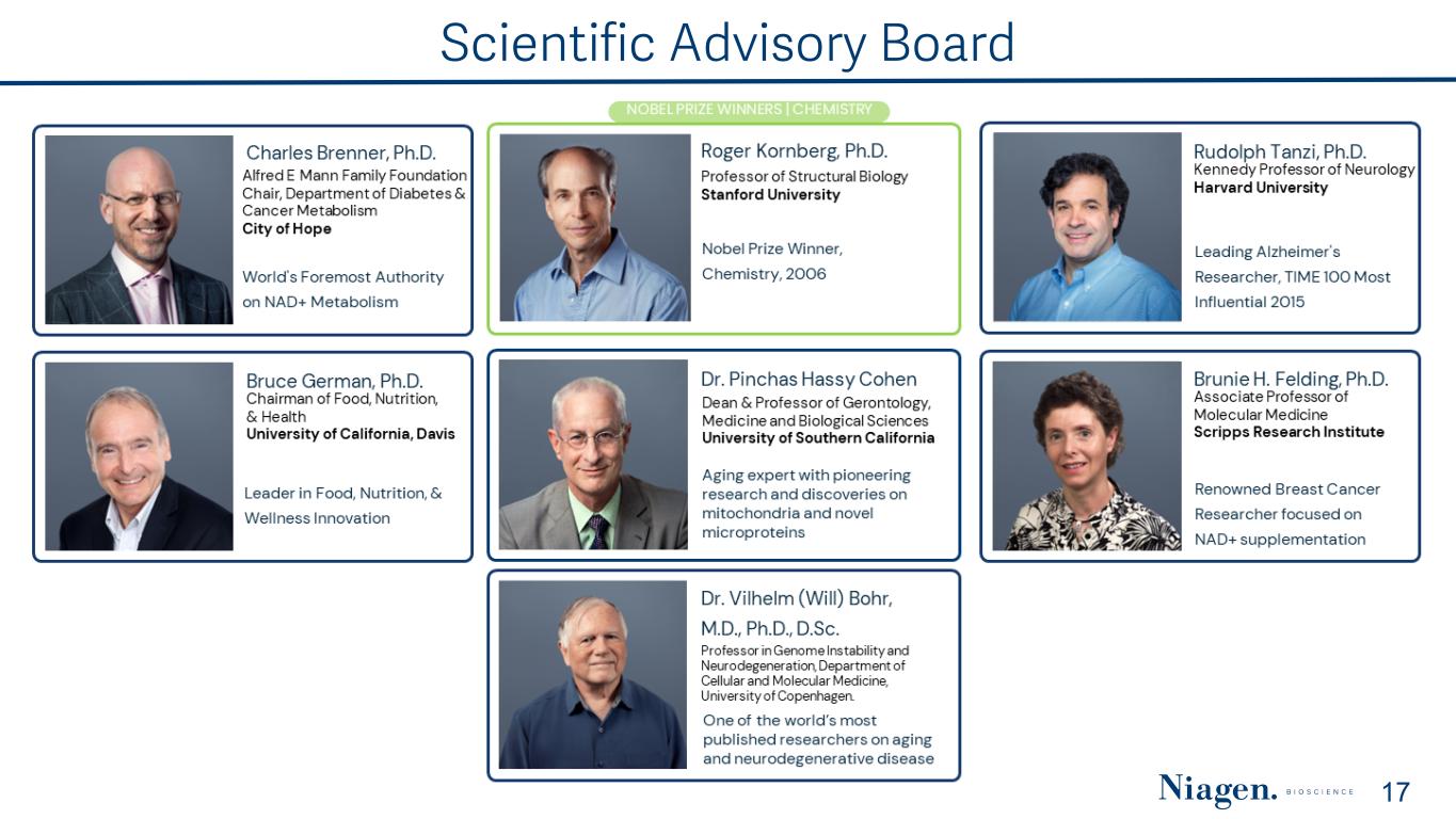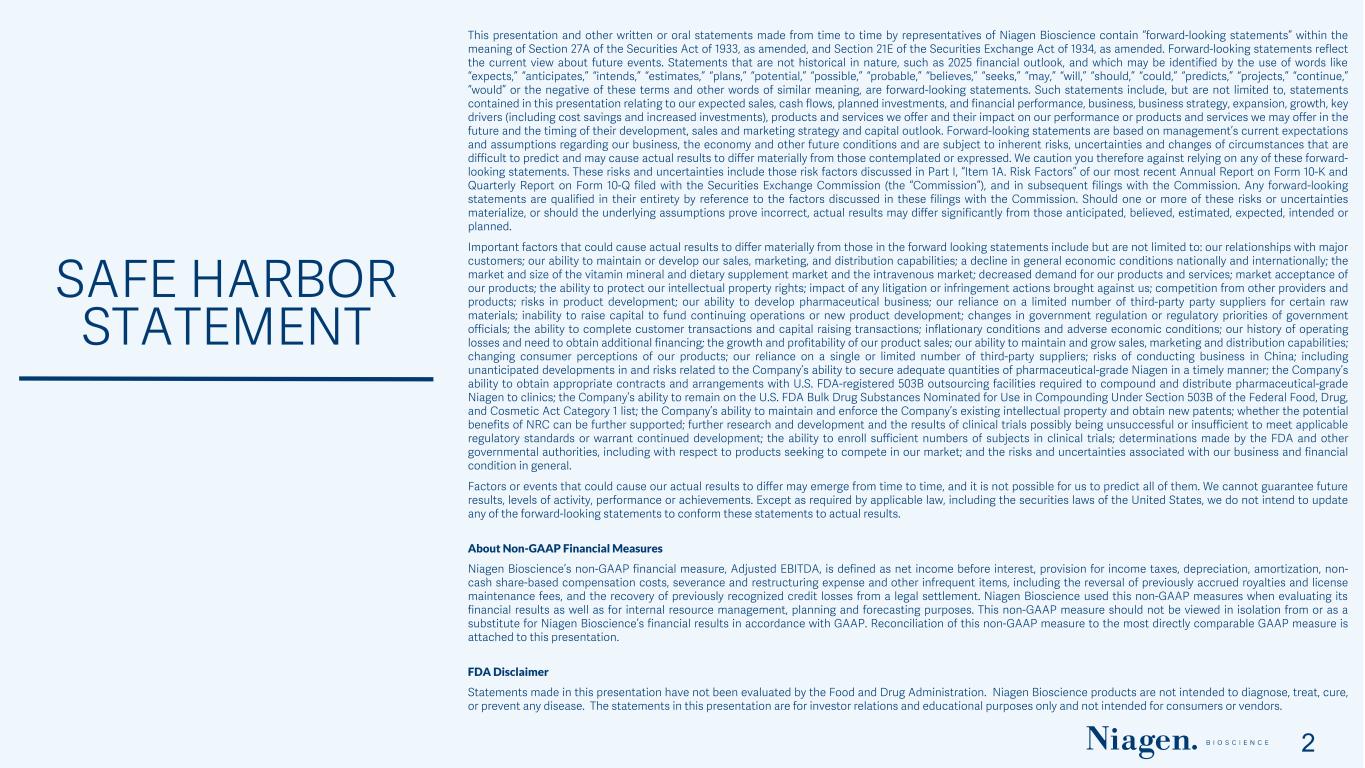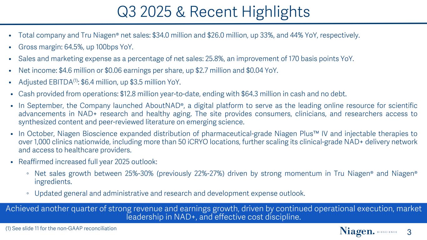 SAFE HARBOR STATEMENT 2 This presentation and other written or oral statements made from time to time by representatives of Niagen Bioscience contain “forward-looking statements” within the meaning of Section 27A of the Securities Act of 1933, as amended, and Section 21E of the Securities Exchange Act of 1934, as amended. Forward-looking statements reflect the current view about future events. Statements that are not historical in nature, such as 2025 financial outlook, and which may be identified by the use of words like “expects,” “anticipates,” “intends,” “estimates,” “plans,” “potential,” “possible,” “probable,” “believes,” “seeks,” “may,” “will,” “should,” “could,” “predicts,” “projects,” “continue,” “would” or the negative of these terms and other words of similar meaning, are forward-looking statements. Such statements include, but are not limited to, statements contained in this presentation relating to our expected sales, cash flows, planned investments, and financial performance, business, business strategy, expansion, growth, key drivers (including cost savings and increased investments), products and services we offer and their impact on our performance or products and services we may offer in the future and the timing of their development, sales and marketing strategy and capital outlook. Forward-looking statements are based on management’s current expectations and assumptions regarding our business, the economy and other future conditions and are subject to inherent risks, uncertainties and changes of circumstances that are difficult to predict and may cause actual results to differ materially from those contemplated or expressed. We caution you therefore against relying on any of these forward- looking statements. These risks and uncertainties include those risk factors discussed in Part I, “Item 1A. Risk Factors” of our most recent Annual Report on Form 10-K and Quarterly Report on Form 10-Q filed with the Securities Exchange Commission (the “Commission”), and in subsequent filings with the Commission. Any forward-looking statements are qualified in their entirety by reference to the factors discussed in these filings with the Commission. Should one or more of these risks or uncertainties materialize, or should the underlying assumptions prove incorrect, actual results may differ significantly from those anticipated, believed, estimated, expected, intended or planned. Important factors that could cause actual results to differ materially from those in the forward looking statements include but are not limited to: our relationships with major customers; our ability to maintain or develop our sales, marketing, and distribution capabilities; a decline in general economic conditions nationally and internationally; the market and size of the vitamin mineral and dietary supplement market and the intravenous market; decreased demand for our products and services; market acceptance of our products; the ability to protect our intellectual property rights; impact of any litigation or infringement actions brought against us; competition from other providers and products; risks in product development; our ability to develop pharmaceutical business; our reliance on a limited number of third-party party suppliers for certain raw materials; inability to raise capital to fund continuing operations or new product development; changes in government regulation or regulatory priorities of government officials; the ability to complete customer transactions and capital raising transactions; inflationary conditions and adverse economic conditions; our history of operating losses and need to obtain additional financing; the growth and profitability of our product sales; our ability to maintain and grow sales, marketing and distribution capabilities; changing consumer perceptions of our products; our reliance on a single or limited number of third-party suppliers; risks of conducting business in China; including unanticipated developments in and risks related to the Company’s ability to secure adequate quantities of pharmaceutical-grade Niagen in a timely manner; the Company’s ability to obtain appropriate contracts and arrangements with U.S. FDA-registered 503B outsourcing facilities required to compound and distribute pharmaceutical-grade Niagen to clinics; the Company’s ability to remain on the U.S. FDA Bulk Drug Substances Nominated for Use in Compounding Under Section 503B of the Federal Food, Drug, and Cosmetic Act Category 1 list; the Company’s ability to maintain and enforce the Company’s existing intellectual property and obtain new patents; whether the potential benefits of NRC can be further supported; further research and development and the results of clinical trials possibly being unsuccessful or insufficient to meet applicable regulatory standards or warrant continued development; the ability to enroll sufficient numbers of subjects in clinical trials; determinations made by the FDA and other governmental authorities, including with respect to products seeking to compete in our market; and the risks and uncertainties associated with our business and financial condition in general. Factors or events that could cause our actual results to differ may emerge from time to time, and it is not possible for us to predict all of them. We cannot guarantee future results, levels of activity, performance or achievements. Except as required by applicable law, including the securities laws of the United States, we do not intend to update any of the forward-looking statements to conform these statements to actual results.  About Non-GAAP Financial Measures Niagen Bioscience’s non-GAAP financial measure, Adjusted EBITDA, is defined as net income before interest, provision for income taxes, depreciation, amortization, non- cash share-based compensation costs, severance and restructuring expense and ot