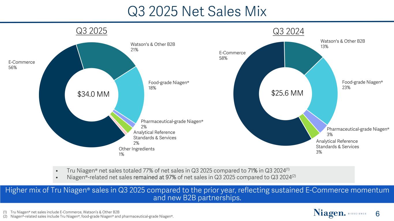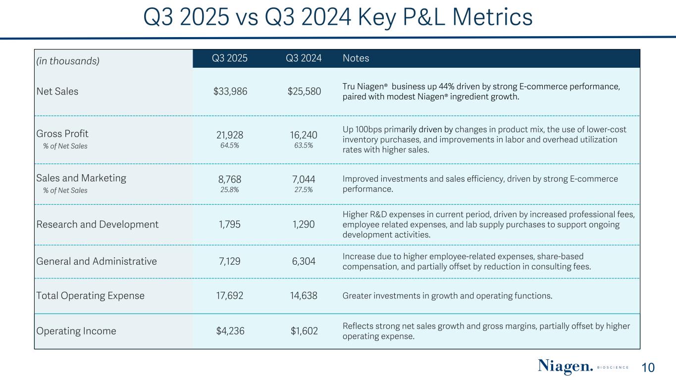 2024 – 2025 Net Sales Summary 9 ($ in millions) 2025 2024 Description Q1 Q2 Q3 Q1 Q2 Q3 Q4 FY Ecommerce 16.8 18.1 19.0 12.9 13.0 14.8 17.3 58.0 Watsons & Other B2B 4.7 4.6 7.0 4.5 5.6 3.3 5.4 18.8 Total TRU NIAGEN 21.5 22.7 26.0 17.4 18.6 18.1 22.7 76.8 Food-grade NIAGEN 7.0 6.0 6.4 4.1 3.1 5.8 4.5 17.5 Pharmaceutical-grade NIAGEN 1.0 1.4 0.5 0.0 0.0 0.9 0.8 1.7 Total NIAGEN Ingredient 8.0 7.4 6.9 4.1 3.1 6.7 5.3 19.2 NIAGEN Related Revenues 29.5 30.1 32.9 21.5 21.7 24.8 28.0 96.0 Other Ingredients 0.2 0.2 0.3 0.0 0.2 0.0 0.4 0.6 Analytical Reference Standards & Services 0.8 0.8 0.8 0.7 0.8 0.8 0.7 3.0 Total Net Sales 30.5 31.1 34.0 22.2 22.7 25.6 29.1 99.6 TRU NIAGEN as % of Total Net Sales 71 % 73 % 77 % 78 % 82 % 71 % 78 % 77 % NIAGEN Related Revenues as % of Total Net Sales 97 % 97 % 97 % 97 % 96 % 97 % 96 % 96 % YOY Growth Rate - Net Sales Total Company 38 % 37 % 33 % (2) % 12 % 31 % 37 % 19 % NIAGEN Related 37 % 38 % 33 % — % 12 % 32 % 38 % 20 % Total TRU NIAGEN 24 % 22 % 44 % (2) % 10 % 4 % 29 % 10 %