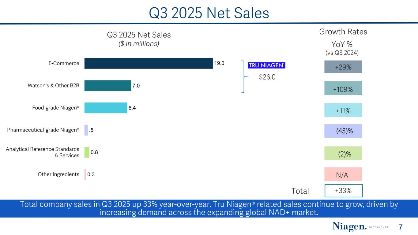 Q3 2025 Net Sales Mix E-Commerce 58% Watson's & Other B2B 13% Food-grade Niagen® 23% Pharmaceutical-grade Niagen® 3% Analytical Reference Standards & Services 3% Q3 2024 $25.6 MM E-Commerce 56% Watson's & Other B2B 21% Food-grade Niagen® 18% Pharmaceutical-grade Niagen® 2% Analytical Reference Standards & Services 2% Other Ingredients 1% $34.0 MM Q3 2025 • Tru Niagen® net sales totaled 77% of net sales in Q3 2025 compared to 71% in Q3 2024(1) • Niagen®-related net sales remained at 97% of net sales in Q3 2025 compared to Q3 2024(2) Higher mix of Tru Niagen® sales in Q3 2025 compared to the prior year, reflecting sustained E-Commerce momentum and new B2B partnerships. (1) Tru Niagen® net sales include E-Commerce, Watson’s & Other B2B (2) Niagen®-related sales include Tru Niagen®, food-grade Niagen® and pharmaceutical-grade Niagen®. 6