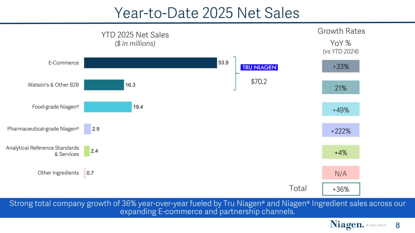 Q3 2025 Net Sales Q3 2025 Net Sales ($ in millions) 19.0 7.0 6.4 .5 0.8 0.3 E-Commerce Watson's & Other B2B Food-grade Niagen® Pharmaceutical-grade Niagen® Analytical Reference Standards & Services Other Ingredients $26.0 YoY % (vs Q3 2024) +29% +109% +11% (2)% +33%Total Growth Rates Total company sales in Q3 2025 up 33% year-over-year. Tru Niagen® related sales continue to grow, driven by increasing demand across the expanding global NAD+ market. 7 N/A (43)%