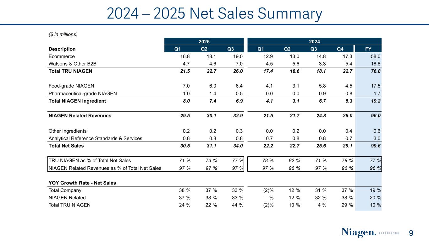 Year-to-Date 2025 Net Sales YTD 2025 Net Sales ($ in millions) Total YoY % (vs YTD 2024) $70.2 53.9 16.3 19.4 2.9 2.4 0.7 E-Commerce Watson's & Other B2B Food-grade Niagen® Pharmaceutical-grade Niagen® Analytical Reference Standards & Services Other Ingredients Growth Rates 8 +33% 21% +49% +4% +36% N/A Strong total company growth of 36% year-over-year fueled by Tru Niagen® and Niagen® Ingredient sales across our expanding E-commerce and partnership channels. +222%
