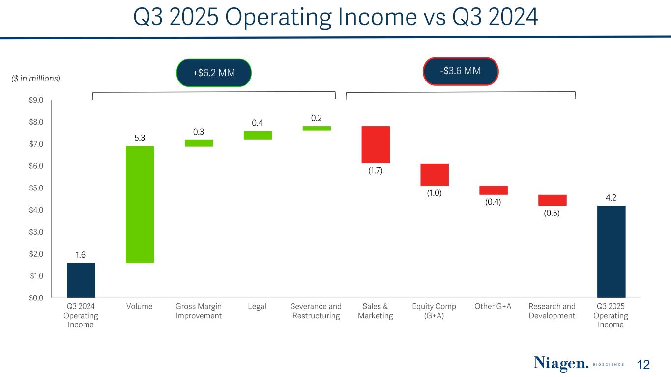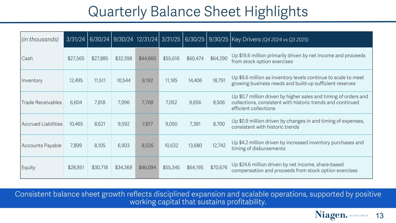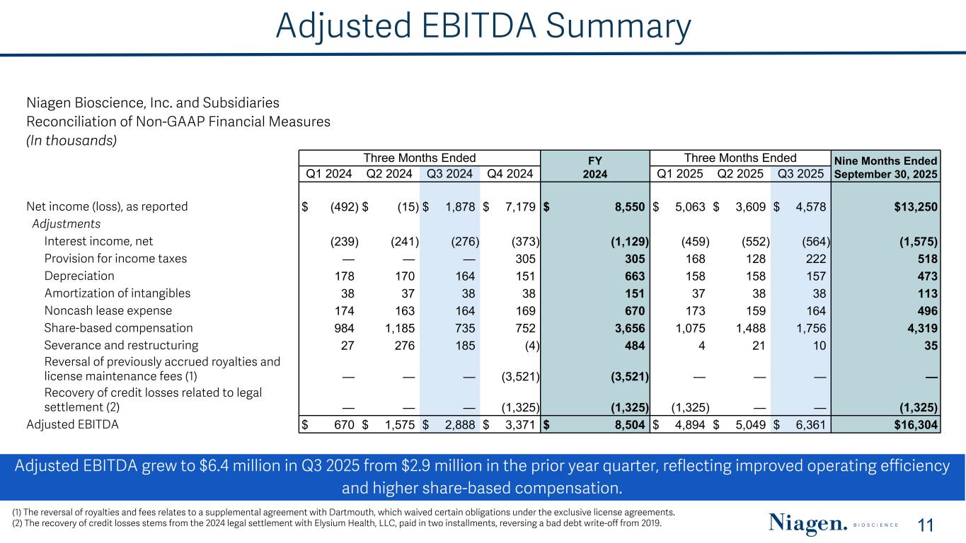 Adjusted EBITDA Summary Adjusted EBITDA grew to $6.4 million in Q3 2025 from $2.9 million in the prior year quarter, reflecting improved operating efficiency and higher share-based compensation. 11 (1) The reversal of royalties and fees relates to a supplemental agreement with Dartmouth, which waived certain obligations under the exclusive license agreements. (2) The recovery of credit losses stems from the 2024 legal settlement with Elysium Health, LLC, paid in two installments, reversing a bad debt write-off from 2019. Niagen Bioscience, Inc. and Subsidiaries Reconciliation of Non-GAAP Financial Measures (In thousands) Three Months Ended FY 2024 Three Months Ended Nine Months Ended September 30, 2025Q1 2024 Q2 2024 Q3 2024 Q4 2024 Q1 2025 Q2 2025 Q3 2025 Net income (loss), as reported $ (492) $ (15) $ 1,878 $ 7,179 $ 8,550 $ 5,063 $ 3,609 $ 4,578 $13,250 Adjustments Interest income, net (239) (241) (276) (373) (1,129) (459) (552) (564) (1,575) Provision for income taxes — — — 305 305 168 128 222 518 Depreciation 178 170 164 151 663 158 158 157 473 Amortization of intangibles 38 37 38 38 151 37 38 38 113 Noncash lease expense 174 163 164 169 670 173 159 164 496 Share-based compensation 984 1,185 735 752 3,656 1,075 1,488 1,756 4,319 Severance and restructuring 27 276 185 (4) 484 4 21 10 35 Reversal of previously accrued royalties and license maintenance fees (1) — — — (3,521) (3,521) — — — — Recovery of credit losses related to legal settlement (2) — — — (1,325) (1,325) (1,325) — — (1,325) Adjusted EBITDA $ 670 $ 1,575 $ 2,888 $ 3,371 $ 8,504 $ 4,894 $ 5,049 $ 6,361 $16,304