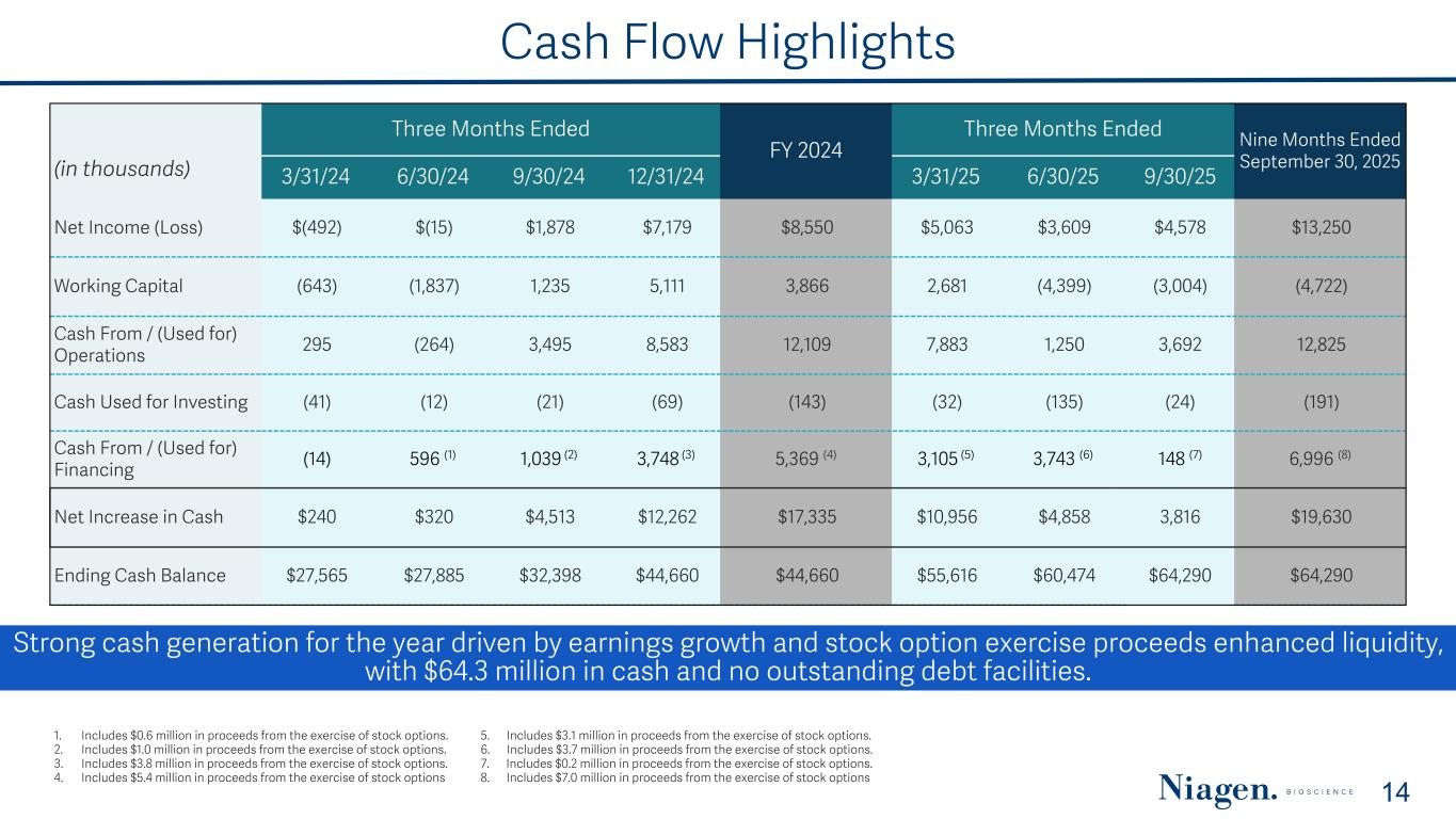 Quarterly Balance Sheet Highlights (in thousands) 3/31/24 6/30/24 9/30/24 12/31/24 3/31/25 6/30/25 9/30/25 Key Drivers (Q4 2024 vs Q3 2025) Cash $27,565 $27,885 $32,398 $44,660 $55,616 $60,474 $64,290 Up $19.6 million primarily driven by net income and proceeds from stock option exercises Inventory 12,495 11,511 10,544 9,192 11,185 14,406 18,791 Up $9.6 million as inventory levels continue to scale to meet growing business needs and build-up sufficient reserves Trade Receivables 6,604 7,818 7,096 7,768 7,052 9,656 8,506 Up $0.7 million driven by higher sales and timing of orders and collections, consistent with historic trends and continued efficient collections Accrued Liabilities 10,465 8,621 9,592 7,817 9,050 7,381 8,700 Up $0.9 million driven by changes in and timing of expenses, consistent with historic trends Accounts Payable 7,899 8,105 6,903 8,526 10,632 13,680 12,742 Up $4.2 million driven by increased inventory purchases and timing of disbursements Equity $28,951 $30,718 $34,369 $46,094 $55,345 $64,195 $70,676 Up $24.6 million driven by net income, share-based compensation and proceeds from stock option exercises Consistent balance sheet growth reflects disciplined expansion and scalable operations, supported by positive working capital that sustains profitability. 13