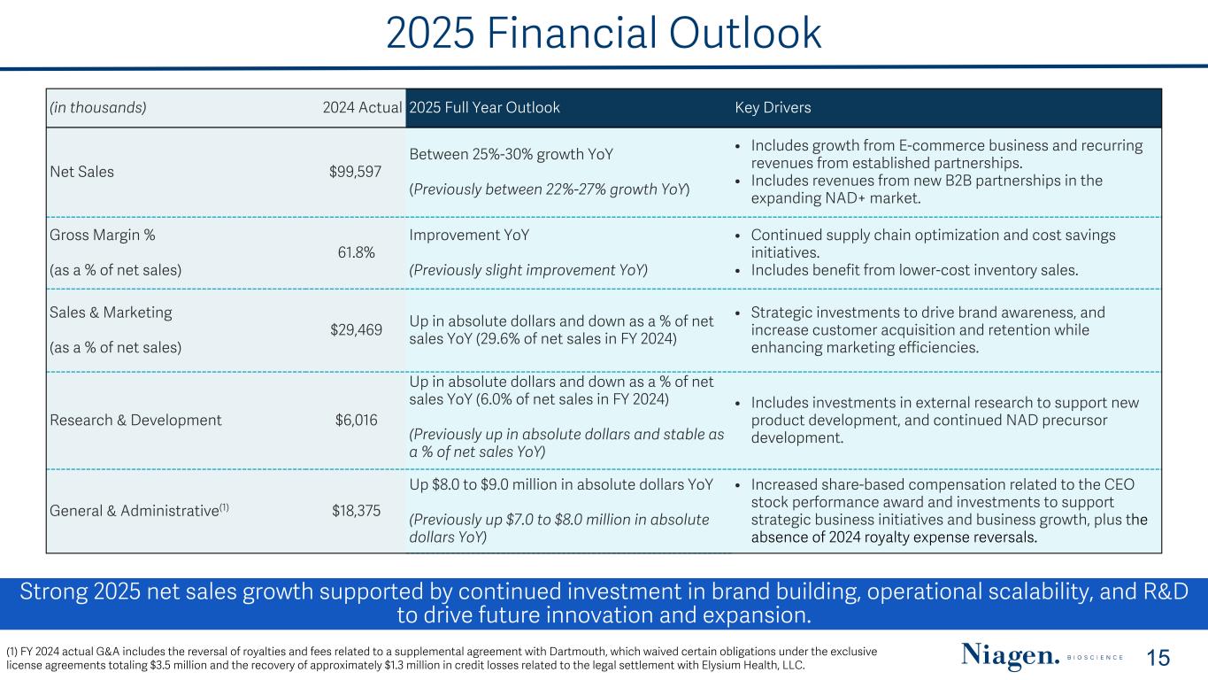2025 Financial Outlook Strong 2025 net sales growth supported by continued investment in brand building, operational scalability, and R&D to drive future innovation and expansion. 15(1) FY 2024 actual G&A includes the reversal of royalties and fees related to a supplemental agreement with Dartmouth, which waived certain obligations under the exclusive license agreements totaling $3.5 million and the recovery of approximately $1.3 million in credit losses related to the legal settlement with Elysium Health, LLC. (in thousands) 2024 Actual 2025 Full Year Outlook Key Drivers Net Sales $99,597 Between 25%-30% growth YoY (Previously between 22%-27% growth YoY) • Includes growth from E-commerce business and recurring revenues from established partnerships. • Includes revenues from new B2B partnerships in the expanding NAD+ market. Gross Margin % (as a % of net sales) 61.8% Improvement YoY (Previously slight improvement YoY) • Continued supply chain optimization and cost savings initiatives. • Includes benefit from lower-cost inventory sales. Sales & Marketing (as a % of net sales) $29,469 Up in absolute dollars and down as a % of net sales YoY (29.6% of net sales in FY 2024) • Strategic investments to drive brand awareness, and increase customer acquisition and retention while enhancing marketing efficiencies. Research & Development $6,016 Up in absolute dollars and down as a % of net sales YoY (6.0% of net sales in FY 2024) (Previously up in absolute dollars and stable as a % of net sales YoY) • Includes investments in external research to support new product development, and continued NAD precursor development. General & Administrative(1) $18,375 Up $8.0 to $9.0 million in absolute dollars YoY (Previously up $7.0 to $8.0 million in absolute dollars YoY) • Increased share-based compensation related to the CEO stock performance award and investments to support strategic business initiatives and business growth, plus the absence of 2024 royalty expense reversals.