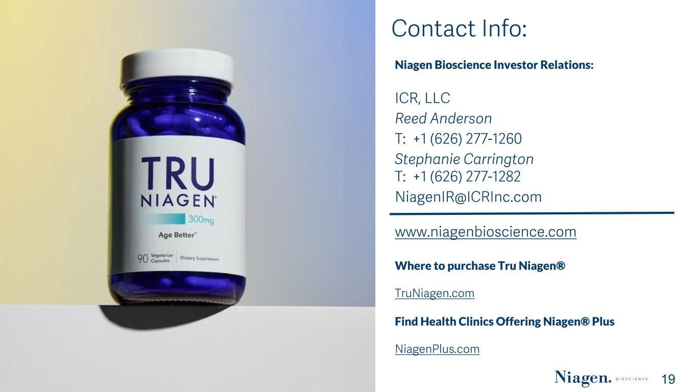 The information contained in this documents is confidential, privileged and only for the information of the intended recipient and may not be used, published or redistributed without the prior written consent (2019) Contact Info: Niagen Bioscience Investor Relations: ICR, LLC Reed Anderson T: +1 (626) 277-1260 Stephanie Carrington T: +1 (626) 277-1282 NiagenIR@ICRInc.com www.niagenbioscience.com Where to purchase Tru Niagen® TruNiagen.com Find Health Clinics Offering Niagen® Plus NiagenPlus.com 19