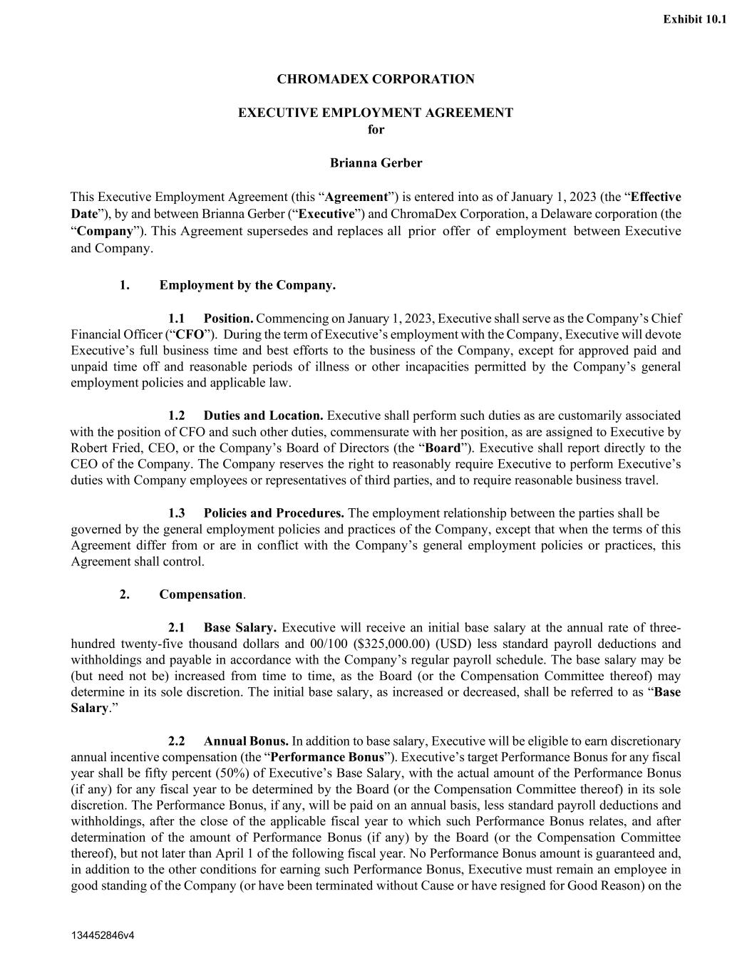 CHROMADEX CORPORATION EXECUTIVE EMPLOYMENT AGREEMENT for Brianna Gerber This Executive Employment Agreement (this “Agreement”) is entered into as of January 1, 2023 (the “Effective Date”), by and between Brianna Gerber (“Executive”) and ChromaDex Corporation, a Delaware corporation (the “Company”). This Agreement supersedes and replaces all prior offer of employment between Executive and Company. 1. Employment by the Company. 1.1 Position. Commencing on January 1, 2023, Executive shall serve as the Company’s Chief Financial Officer (“CFO”). During the term of Executive’s employment with the Company, Executive will devote Executive’s full business time and best efforts to the business of the Company, except for approved paid and unpaid time off and reasonable periods of illness or other incapacities permitted by the Company’s general employment policies and applicable law. 1.2 Duties and Location. Executive shall perform such duties as are customarily associated with the position of CFO and such other duties, commensurate with her position, as are assigned to Executive by Robert Fried, CEO, or the Company’s Board of Directors (the “Board”). Executive shall report directly to the CEO of the Company. The Company reserves the right to reasonably require Executive to perform Executive’s duties with Company employees or representatives of third parties, and to require reasonable business travel. 1.3 Policies and Procedures. The employment relationship between the parties shall be governed by the general employment policies and practices of the Company, except that when the terms of this Agreement differ from or are in conflict with the Company’s general employment policies or practices, this Agreement shall control. 2. Compensation. 2.1 Base Salary. Executive will receive an initial base salary at the annual rate of three- hundred twenty-five thousand dollars and 00/100 ($325,000.00) (USD) less standard payroll deductions and withholdings and payable in accordance with the Company’s regular payroll schedule. The base salary may be (but need not be) increased from time to time, as the Board (or the Compensation Committee thereof) may determine in its sole discretion. The initial base salary, as increased or decreased, shall be referred to as “Base Salary.” 2.2 Annual Bonus. In addition to base salary, Executive will be eligible to earn discretionary annual incentive compensation (the “Performance Bonus”). Executive’s target Performance Bonus for any fiscal year shall be fifty percent (50%) of Executive’s Base Salary, with the actual amount of the Performance Bonus (if any) for any fiscal year to be determined by the Board (or the Compensation Committee thereof) in its sole discretion. The Performance Bonus, if any, will be paid on an annual basis, less standard payroll deductions and withholdings, after the close of the applicable fiscal year to which such Performance Bonus relates, and after determination of the amount of Performance Bonus (if any) by the Board (or the Compensation Committee thereof), but not later than April 1 of the following fiscal year. No Performance Bonus amount is guaranteed and, in addition to the other conditions for earning such Performance Bonus, Executive must remain an employee in good standing of the Company (or have been terminated without Cause or have resigned for Good Reason) on the 134452846v4 Exhibit 10.1