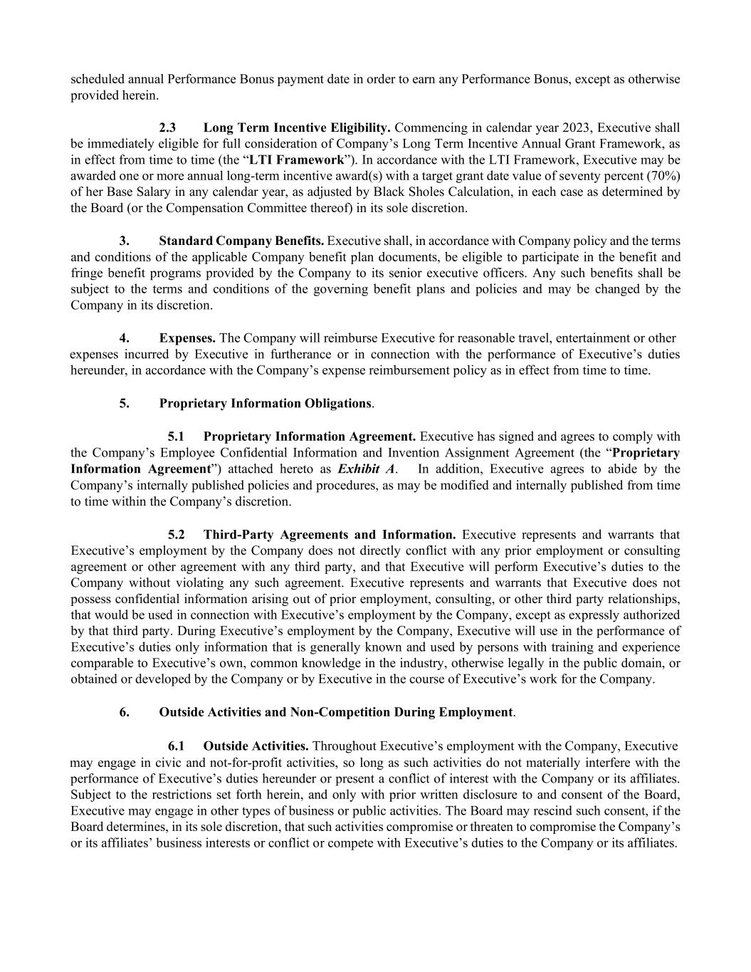scheduled annual Performance Bonus payment date in order to earn any Performance Bonus, except as otherwise provided herein. 2.3 Long Term Incentive Eligibility. Commencing in calendar year 2023, Executive shall be immediately eligible for full consideration of Company’s Long Term Incentive Annual Grant Framework, as in effect from time to time (the “LTI Framework”). In accordance with the LTI Framework, Executive may be awarded one or more annual long-term incentive award(s) with a target grant date value of seventy percent (70%) of her Base Salary in any calendar year, as adjusted by Black Sholes Calculation, in each case as determined by the Board (or the Compensation Committee thereof) in its sole discretion. 3. Standard Company Benefits. Executive shall, in accordance with Company policy and the terms and conditions of the applicable Company benefit plan documents, be eligible to participate in the benefit and fringe benefit programs provided by the Company to its senior executive officers. Any such benefits shall be subject to the terms and conditions of the governing benefit plans and policies and may be changed by the Company in its discretion. 4. Expenses. The Company will reimburse Executive for reasonable travel, entertainment or other expenses incurred by Executive in furtherance or in connection with the performance of Executive’s duties hereunder, in accordance with the Company’s expense reimbursement policy as in effect from time to time. 5. Proprietary Information Obligations. 5.1 Proprietary Information Agreement. Executive has signed and agrees to comply with the Company’s Employee Confidential Information and Invention Assignment Agreement (the “Proprietary Information Agreement”) attached hereto as Exhibit A. In addition, Executive agrees to abide by the Company’s internally published policies and procedures, as may be modified and internally published from time to time within the Company’s discretion. 5.2 Third-Party Agreements and Information. Executive represents and warrants that Executive’s employment by the Company does not directly conflict with any prior employment or consulting agreement or other agreement with any third party, and that Executive will perform Executive’s duties to the Company without violating any such agreement. Executive represents and warrants that Executive does not possess confidential information arising out of prior employment, consulting, or other third party relationships, that would be used in connection with Executive’s employment by the Company, except as expressly authorized by that third party. During Executive’s employment by the Company, Executive will use in the performance of Executive’s duties only information that is generally known and used by persons with training and experience comparable to Executive’s own, common knowledge in the industry, otherwise legally in the public domain, or obtained or developed by the Company or by Executive in the course of Executive’s work for the Company. 6. Outside Activities and Non-Competition During Employment. 6.1 Outside Activities. Throughout Executive’s employment with the Company, Executive may engage in civic and not-for-profit activities, so long as such activities do not materially interfere with the performance of Executive’s duties hereunder or present a conflict of interest with the Company or its affiliates. Subject to the restrictions set forth herein, and only with prior written disclosure to and consent of the Board, Executive may engage in other types of business or public activities. The Board may rescind such consent, if the Board determines, in its sole discretion, that such activities compromise or threaten to compromise the Company’s or its affiliates’ business interests or conflict or compete with Executive’s duties to the Company or its affiliates.