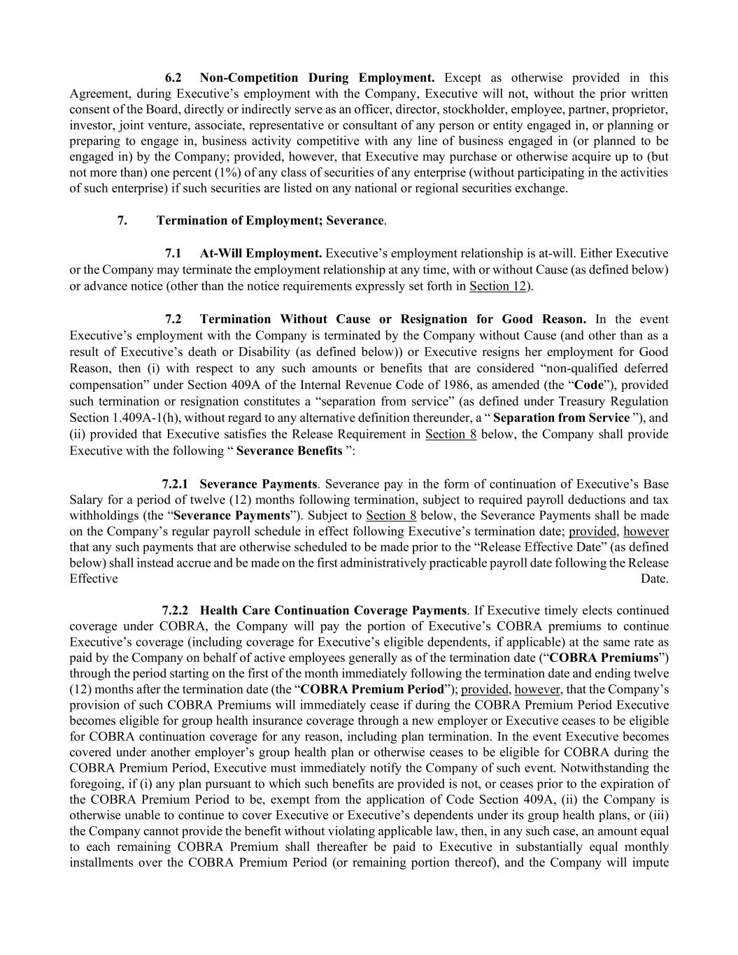 6.2 Non-Competition During Employment. Except as otherwise provided in this Agreement, during Executive’s employment with the Company, Executive will not, without the prior written consent of the Board, directly or indirectly serve as an officer, director, stockholder, employee, partner, proprietor, investor, joint venture, associate, representative or consultant of any person or entity engaged in, or planning or preparing to engage in, business activity competitive with any line of business engaged in (or planned to be engaged in) by the Company; provided, however, that Executive may purchase or otherwise acquire up to (but not more than) one percent (1%) of any class of securities of any enterprise (without participating in the activities of such enterprise) if such securities are listed on any national or regional securities exchange. 7. Termination of Employment; Severance. 7.1 At-Will Employment. Executive’s employment relationship is at-will. Either Executive or the Company may terminate the employment relationship at any time, with or without Cause (as defined below) or advance notice (other than the notice requirements expressly set forth in Section 12). 7.2 Termination Without Cause or Resignation for Good Reason. In the event Executive’s employment with the Company is terminated by the Company without Cause (and other than as a result of Executive’s death or Disability (as defined below)) or Executive resigns her employment for Good Reason, then (i) with respect to any such amounts or benefits that are considered “non-qualified deferred compensation” under Section 409A of the Internal Revenue Code of 1986, as amended (the “Code”), provided such termination or resignation constitutes a “separation from service” (as defined under Treasury Regulation Section 1.409A-1(h), without regard to any alternative definition thereunder, a “ Separation from Service ”), and (ii) provided that Executive satisfies the Release Requirement in Section 8 below, the Company shall provide Executive with the following “ Severance Benefits ”: 7.2.1 Severance Payments. Severance pay in the form of continuation of Executive’s Base Salary for a period of twelve (12) months following termination, subject to required payroll deductions and tax withholdings (the “Severance Payments”). Subject to Section 8 below, the Severance Payments shall be made on the Company’s regular payroll schedule in effect following Executive’s termination date; provided, however that any such payments that are otherwise scheduled to be made prior to the “Release Effective Date” (as defined below) shall instead accrue and be made on the first administratively practicable payroll date following the Release Effective Date. 7.2.2 Health Care Continuation Coverage Payments. If Executive timely elects continued coverage under COBRA, the Company will pay the portion of Executive’s COBRA premiums to continue Executive’s coverage (including coverage for Executive’s eligible dependents, if applicable) at the same rate as paid by the Company on behalf of active employees generally as of the termination date (“COBRA Premiums”) through the period starting on the first of the month immediately following the termination date and ending twelve (12) months after the termination date (the “COBRA Premium Period”); provided, however, that the Company’s provision of such COBRA Premiums will immediately cease if during the COBRA Premium Period Executive becomes eligible for group health insurance coverage through a new employer or Executive ceases to be eligible for COBRA continuation coverage for any reason, including plan termination. In the event Executive becomes covered under another employer’s group health plan or otherwise ceases to be eligible for COBRA during the COBRA Premium Period, Executive must immediately notify the Company of such event. Notwithstanding the foregoing, if (i) any plan pursuant to which such benefits are provided is not, or ceases prior to the expiration of the COBRA Premium Period to be, exempt from the application of Code Section 409A, (ii) the Company is otherwise unable to continue to cover Executive or Executive’s dependents under its group health plans, or (iii) the Company cannot provide the benefit without violating applicable law, then, in any such case, an amount equal to each remaining COBRA Premium shall thereafter be paid to Executive in substantially equal monthly installments over the COBRA Premium Period (or remaining portion thereof), and the Company will impute