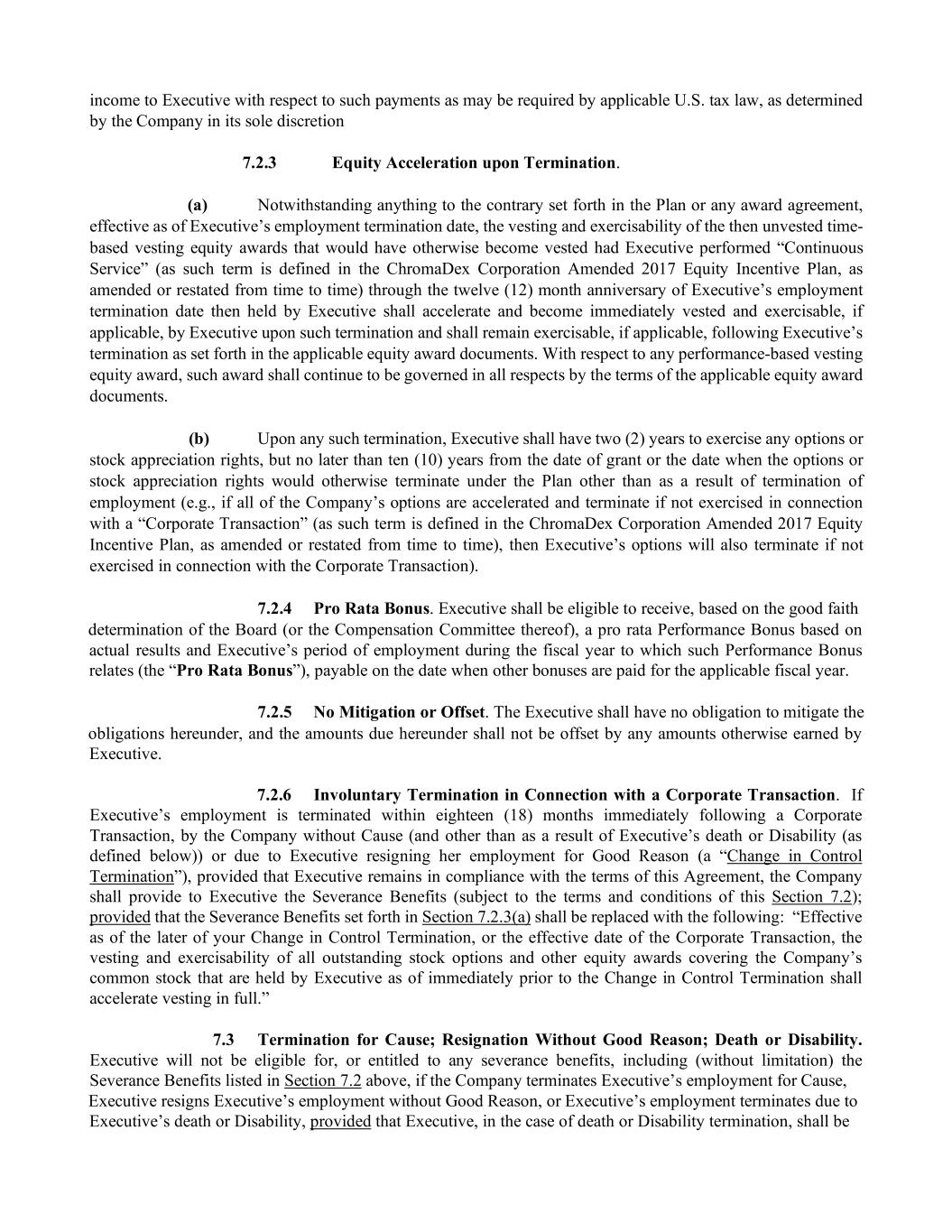 income to Executive with respect to such payments as may be required by applicable U.S. tax law, as determined by the Company in its sole discretion 7.2.3 Equity Acceleration upon Termination. (a) Notwithstanding anything to the contrary set forth in the Plan or any award agreement, effective as of Executive’s employment termination date, the vesting and exercisability of the then unvested time- based vesting equity awards that would have otherwise become vested had Executive performed “Continuous Service” (as such term is defined in the ChromaDex Corporation Amended 2017 Equity Incentive Plan, as amended or restated from time to time) through the twelve (12) month anniversary of Executive’s employment termination date then held by Executive shall accelerate and become immediately vested and exercisable, if applicable, by Executive upon such termination and shall remain exercisable, if applicable, following Executive’s termination as set forth in the applicable equity award documents. With respect to any performance-based vesting equity award, such award shall continue to be governed in all respects by the terms of the applicable equity award documents. (b) Upon any such termination, Executive shall have two (2) years to exercise any options or stock appreciation rights, but no later than ten (10) years from the date of grant or the date when the options or stock appreciation rights would otherwise terminate under the Plan other than as a result of termination of employment (e.g., if all of the Company’s options are accelerated and terminate if not exercised in connection with a “Corporate Transaction” (as such term is defined in the ChromaDex Corporation Amended 2017 Equity Incentive Plan, as amended or restated from time to time), then Executive’s options will also terminate if not exercised in connection with the Corporate Transaction). 7.2.4 Pro Rata Bonus. Executive shall be eligible to receive, based on the good faith determination of the Board (or the Compensation Committee thereof), a pro rata Performance Bonus based on actual results and Executive’s period of employment during the fiscal year to which such Performance Bonus relates (the “Pro Rata Bonus”), payable on the date when other bonuses are paid for the applicable fiscal year. 7.2.5 No Mitigation or Offset. The Executive shall have no obligation to mitigate the obligations hereunder, and the amounts due hereunder shall not be offset by any amounts otherwise earned by Executive. 7.2.6 Involuntary Termination in Connection with a Corporate Transaction. If Executive’s employment is terminated within eighteen (18) months immediately following a Corporate Transaction, by the Company without Cause (and other than as a result of Executive’s death or Disability (as defined below)) or due to Executive resigning her employment for Good Reason (a “Change in Control Termination”), provided that Executive remains in compliance with the terms of this Agreement, the Company shall provide to Executive the Severance Benefits (subject to the terms and conditions of this Section 7.2); provided that the Severance Benefits set forth in Section 7.2.3(a) shall be replaced with the following: “Effective as of the later of your Change in Control Termination, or the effective date of the Corporate Transaction, the vesting and exercisability of all outstanding stock options and other equity awards covering the Company’s common stock that are held by Executive as of immediately prior to the Change in Control Termination shall accelerate vesting in full.” 7.3 Termination for Cause; Resignation Without Good Reason; Death or Disability. Executive will not be eligible for, or entitled to any severance benefits, including (without limitation) the Severance Benefits listed in Section 7.2 above, if the Company terminates Executive’s employment for Cause, Executive resigns Executive’s employment without Good Reason, or Executive’s employment terminates due to Executive’s death or Disability, provided that Executive, in the case of death or Disability termination, shall be