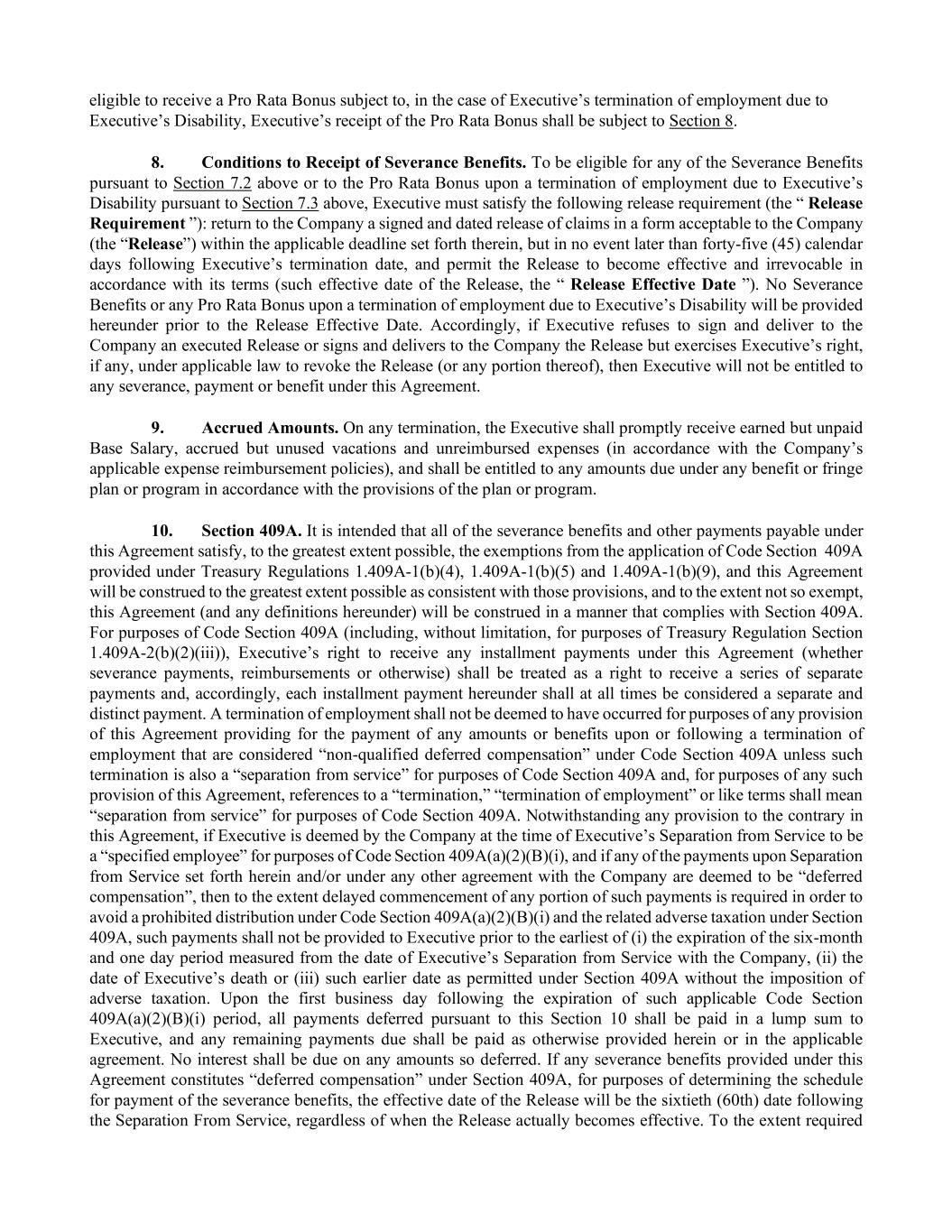 eligible to receive a Pro Rata Bonus subject to, in the case of Executive’s termination of employment due to Executive’s Disability, Executive’s receipt of the Pro Rata Bonus shall be subject to Section 8. 8. Conditions to Receipt of Severance Benefits. To be eligible for any of the Severance Benefits pursuant to Section 7.2 above or to the Pro Rata Bonus upon a termination of employment due to Executive’s Disability pursuant to Section 7.3 above, Executive must satisfy the following release requirement (the “ Release Requirement ”): return to the Company a signed and dated release of claims in a form acceptable to the Company (the “Release”) within the applicable deadline set forth therein, but in no event later than forty-five (45) calendar days following Executive’s termination date, and permit the Release to become effective and irrevocable in accordance with its terms (such effective date of the Release, the “ Release Effective Date ”). No Severance Benefits or any Pro Rata Bonus upon a termination of employment due to Executive’s Disability will be provided hereunder prior to the Release Effective Date. Accordingly, if Executive refuses to sign and deliver to the Company an executed Release or signs and delivers to the Company the Release but exercises Executive’s right, if any, under applicable law to revoke the Release (or any portion thereof), then Executive will not be entitled to any severance, payment or benefit under this Agreement. 9. Accrued Amounts. On any termination, the Executive shall promptly receive earned but unpaid Base Salary, accrued but unused vacations and unreimbursed expenses (in accordance with the Company’s applicable expense reimbursement policies), and shall be entitled to any amounts due under any benefit or fringe plan or program in accordance with the provisions of the plan or program. 10. Section 409A. It is intended that all of the severance benefits and other payments payable under this Agreement satisfy, to the greatest extent possible, the exemptions from the application of Code Section 409A provided under Treasury Regulations 1.409A-1(b)(4), 1.409A-1(b)(5) and 1.409A-1(b)(9), and this Agreement will be construed to the greatest extent possible as consistent with those provisions, and to the extent not so exempt, this Agreement (and any definitions hereunder) will be construed in a manner that complies with Section 409A. For purposes of Code Section 409A (including, without limitation, for purposes of Treasury Regulation Section 1.409A-2(b)(2)(iii)), Executive’s right to receive any installment payments under this Agreement (whether severance payments, reimbursements or otherwise) shall be treated as a right to receive a series of separate payments and, accordingly, each installment payment hereunder shall at all times be considered a separate and distinct payment. A termination of employment shall not be deemed to have occurred for purposes of any provision of this Agreement providing for the payment of any amounts or benefits upon or following a termination of employment that are considered “non-qualified deferred compensation” under Code Section 409A unless such termination is also a “separation from service” for purposes of Code Section 409A and, for purposes of any such provision of this Agreement, references to a “termination,” “termination of employment” or like terms shall mean “separation from service” for purposes of Code Section 409A. Notwithstanding any provision to the contrary in this Agreement, if Executive is deemed by the Company at the time of Executive’s Separation from Service to be a “specified employee” for purposes of Code Section 409A(a)(2)(B)(i), and if any of the payments upon Separation from Service set forth herein and/or under any other agreement with the Company are deemed to be “deferred compensation”, then to the extent delayed commencement of any portion of such payments is required in order to avoid a prohibited distribution under Code Section 409A(a)(2)(B)(i) and the related adverse taxation under Section 409A, such payments shall not be provided to Executive prior to the earliest of (i) the expiration of the six-month and one day period measured from the date of Executive’s Separation from Service with the Company, (ii) the date of Executive’s death or (iii) such earlier date as permitted under Section 409A without the imposition of adverse taxation. Upon the first business day following the expiration of such applicable Code Section 409A(a)(2)(B)(i) period, all payments deferred pursuant to this Section 10 shall be paid in a lump sum to Executive, and any remaining payments due shall be paid as otherwise provided herein or in the applicable agreement. No interest shall be due on any amounts so deferred. If any severance benefits provided under this Agreement constitutes “deferred compensation” under Section 409A, for purposes of determining the schedule for payment of the severance benefits, the effective date of the Release will be the sixtieth (60th) date following the Separation From Service, regardless of when the Release actually becomes effective. To the extent required
