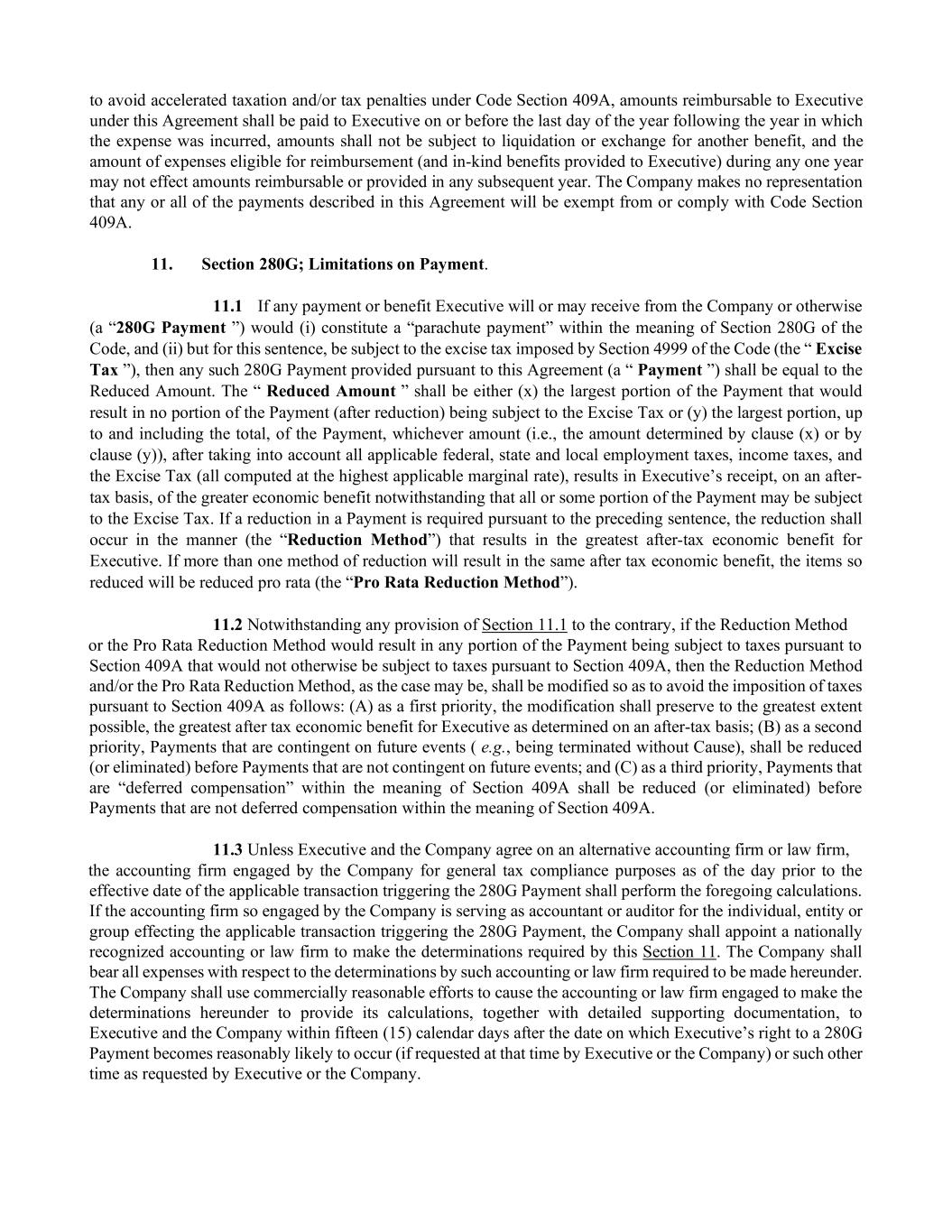 to avoid accelerated taxation and/or tax penalties under Code Section 409A, amounts reimbursable to Executive under this Agreement shall be paid to Executive on or before the last day of the year following the year in which the expense was incurred, amounts shall not be subject to liquidation or exchange for another benefit, and the amount of expenses eligible for reimbursement (and in-kind benefits provided to Executive) during any one year may not effect amounts reimbursable or provided in any subsequent year. The Company makes no representation that any or all of the payments described in this Agreement will be exempt from or comply with Code Section 409A. 11. Section 280G; Limitations on Payment. 11.1 If any payment or benefit Executive will or may receive from the Company or otherwise (a “280G Payment ”) would (i) constitute a “parachute payment” within the meaning of Section 280G of the Code, and (ii) but for this sentence, be subject to the excise tax imposed by Section 4999 of the Code (the “ Excise Tax ”), then any such 280G Payment provided pursuant to this Agreement (a “ Payment ”) shall be equal to the Reduced Amount. The “ Reduced Amount ” shall be either (x) the largest portion of the Payment that would result in no portion of the Payment (after reduction) being subject to the Excise Tax or (y) the largest portion, up to and including the total, of the Payment, whichever amount (i.e., the amount determined by clause (x) or by clause (y)), after taking into account all applicable federal, state and local employment taxes, income taxes, and the Excise Tax (all computed at the highest applicable marginal rate), results in Executive’s receipt, on an after- tax basis, of the greater economic benefit notwithstanding that all or some portion of the Payment may be subject to the Excise Tax. If a reduction in a Payment is required pursuant to the preceding sentence, the reduction shall occur in the manner (the “Reduction Method”) that results in the greatest after-tax economic benefit for Executive. If more than one method of reduction will result in the same after tax economic benefit, the items so reduced will be reduced pro rata (the “Pro Rata Reduction Method”). 11.2 Notwithstanding any provision of Section 11.1 to the contrary, if the Reduction Method or the Pro Rata Reduction Method would result in any portion of the Payment being subject to taxes pursuant to Section 409A that would not otherwise be subject to taxes pursuant to Section 409A, then the Reduction Method and/or the Pro Rata Reduction Method, as the case may be, shall be modified so as to avoid the imposition of taxes pursuant to Section 409A as follows: (A) as a first priority, the modification shall preserve to the greatest extent possible, the greatest after tax economic benefit for Executive as determined on an after-tax basis; (B) as a second priority, Payments that are contingent on future events ( e.g., being terminated without Cause), shall be reduced (or eliminated) before Payments that are not contingent on future events; and (C) as a third priority, Payments that are “deferred compensation” within the meaning of Section 409A shall be reduced (or eliminated) before Payments that are not deferred compensation within the meaning of Section 409A. 11.3 Unless Executive and the Company agree on an alternative accounting firm or law firm, the accounting firm engaged by the Company for general tax compliance purposes as of the day prior to the effective date of the applicable transaction triggering the 280G Payment shall perform the foregoing calculations. If the accounting firm so engaged by the Company is serving as accountant or auditor for the individual, entity or group effecting the applicable transaction triggering the 280G Payment, the Company shall appoint a nationally recognized accounting or law firm to make the determinations required by this Section 11. The Company shall bear all expenses with respect to the determinations by such accounting or law firm required to be made hereunder. The Company shall use commercially reasonable efforts to cause the accounting or law firm engaged to make the determinations hereunder to provide its calculations, together with detailed supporting documentation, to Executive and the Company within fifteen (15) calendar days after the date on which Executive’s right to a 280G Payment becomes reasonably likely to occur (if requested at that time by Executive or the Company) or such other time as requested by Executive or the Company.