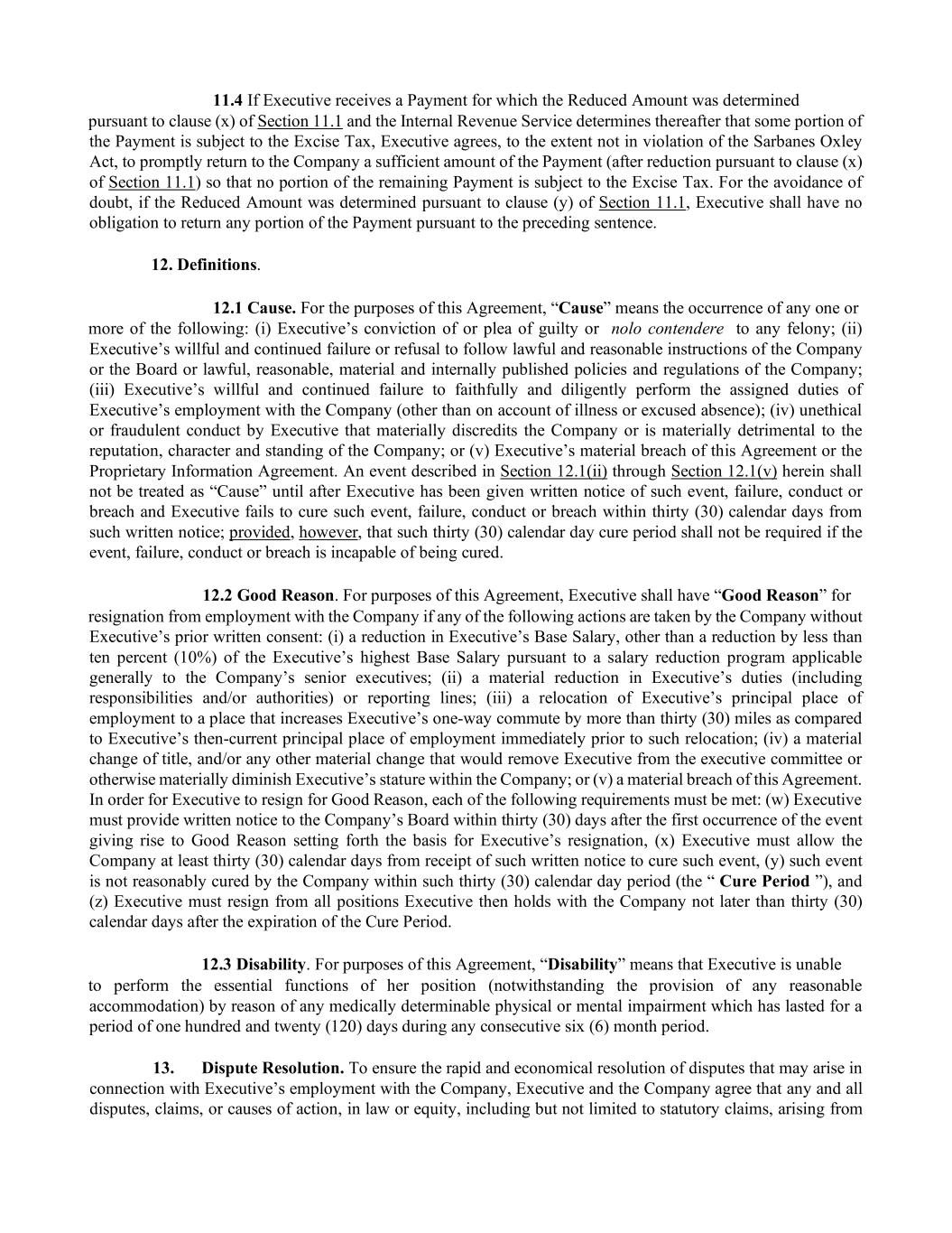 11.4 If Executive receives a Payment for which the Reduced Amount was determined pursuant to clause (x) of Section 11.1 and the Internal Revenue Service determines thereafter that some portion of the Payment is subject to the Excise Tax, Executive agrees, to the extent not in violation of the Sarbanes Oxley Act, to promptly return to the Company a sufficient amount of the Payment (after reduction pursuant to clause (x) of Section 11.1) so that no portion of the remaining Payment is subject to the Excise Tax. For the avoidance of doubt, if the Reduced Amount was determined pursuant to clause (y) of Section 11.1, Executive shall have no obligation to return any portion of the Payment pursuant to the preceding sentence. 12. Definitions. 12.1 Cause. For the purposes of this Agreement, “Cause” means the occurrence of any one or more of the following: (i) Executive’s conviction of or plea of guilty or nolo contendere to any felony; (ii) Executive’s willful and continued failure or refusal to follow lawful and reasonable instructions of the Company or the Board or lawful, reasonable, material and internally published policies and regulations of the Company; (iii) Executive’s willful and continued failure to faithfully and diligently perform the assigned duties of Executive’s employment with the Company (other than on account of illness or excused absence); (iv) unethical or fraudulent conduct by Executive that materially discredits the Company or is materially detrimental to the reputation, character and standing of the Company; or (v) Executive’s material breach of this Agreement or the Proprietary Information Agreement. An event described in Section 12.1(ii) through Section 12.1(v) herein shall not be treated as “Cause” until after Executive has been given written notice of such event, failure, conduct or breach and Executive fails to cure such event, failure, conduct or breach within thirty (30) calendar days from such written notice; provided, however, that such thirty (30) calendar day cure period shall not be required if the event, failure, conduct or breach is incapable of being cured. 12.2 Good Reason. For purposes of this Agreement, Executive shall have “Good Reason” for resignation from employment with the Company if any of the following actions are taken by the Company without Executive’s prior written consent: (i) a reduction in Executive’s Base Salary, other than a reduction by less than ten percent (10%) of the Executive’s highest Base Salary pursuant to a salary reduction program applicable generally to the Company’s senior executives; (ii) a material reduction in Executive’s duties (including responsibilities and/or authorities) or reporting lines; (iii) a relocation of Executive’s principal place of employment to a place that increases Executive’s one-way commute by more than thirty (30) miles as compared to Executive’s then-current principal place of employment immediately prior to such relocation; (iv) a material change of title, and/or any other material change that would remove Executive from the executive committee or otherwise materially diminish Executive’s stature within the Company; or (v) a material breach of this Agreement. In order for Executive to resign for Good Reason, each of the following requirements must be met: (w) Executive must provide written notice to the Company’s Board within thirty (30) days after the first occurrence of the event giving rise to Good Reason setting forth the basis for Executive’s resignation, (x) Executive must allow the Company at least thirty (30) calendar days from receipt of such written notice to cure such event, (y) such event is not reasonably cured by the Company within such thirty (30) calendar day period (the “ Cure Period ”), and (z) Executive must resign from all positions Executive then holds with the Company not later than thirty (30) calendar days after the expiration of the Cure Period. 12.3 Disability. For purposes of this Agreement, “Disability” means that Executive is unable to perform the essential functions of her position (notwithstanding the provision of any reasonable accommodation) by reason of any medically determinable physical or mental impairment which has lasted for a period of one hundred and twenty (120) days during any consecutive six (6) month period. 13. Dispute Resolution. To ensure the rapid and economical resolution of disputes that may arise in connection with Executive’s employment with the Company, Executive and the Company agree that any and all disputes, claims, or causes of action, in law or equity, including but not limited to statutory claims, arising from