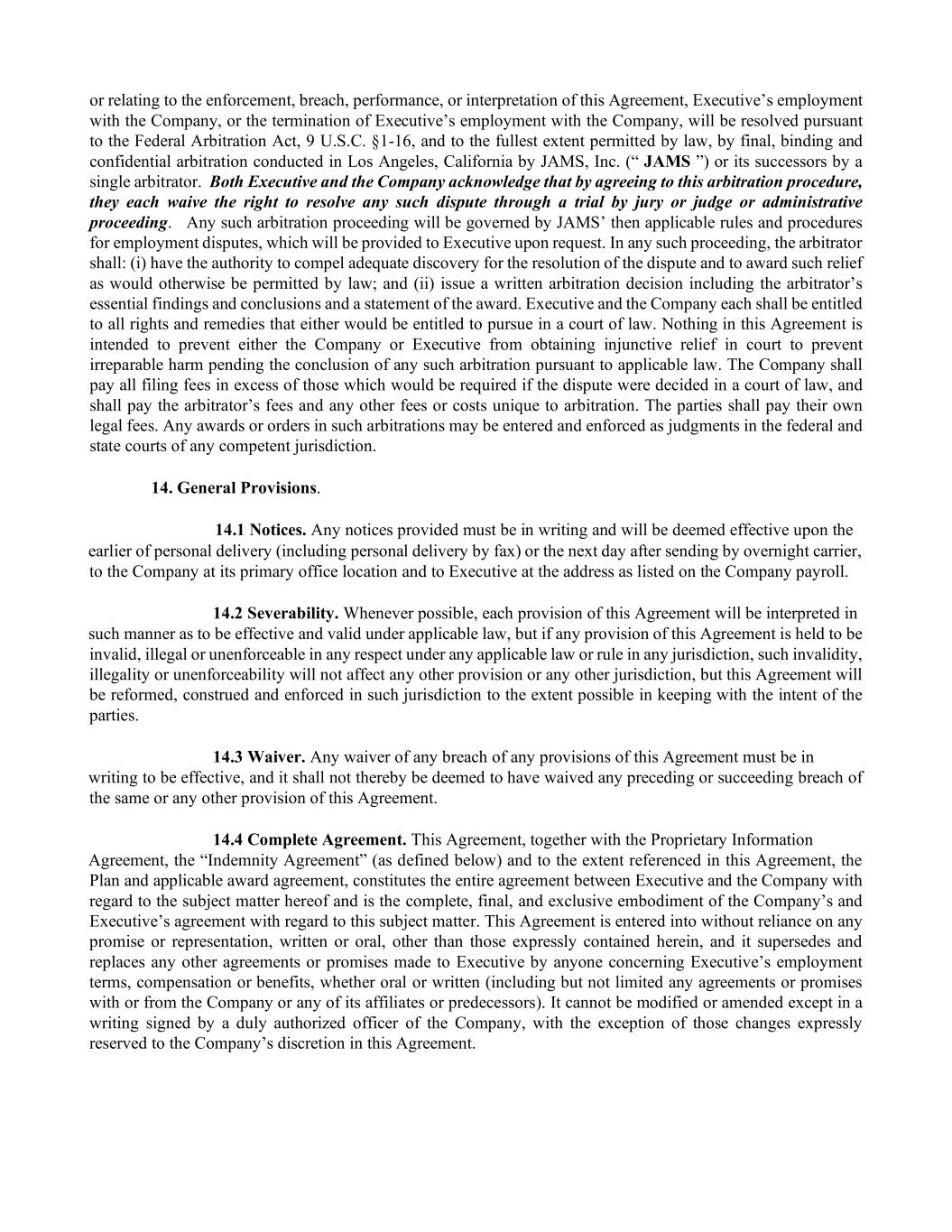 or relating to the enforcement, breach, performance, or interpretation of this Agreement, Executive’s employment with the Company, or the termination of Executive’s employment with the Company, will be resolved pursuant to the Federal Arbitration Act, 9 U.S.C. §1-16, and to the fullest extent permitted by law, by final, binding and confidential arbitration conducted in Los Angeles, California by JAMS, Inc. (“ JAMS ”) or its successors by a single arbitrator. Both Executive and the Company acknowledge that by agreeing to this arbitration procedure, they each waive the right to resolve any such dispute through a trial by jury or judge or administrative proceeding. Any such arbitration proceeding will be governed by JAMS’ then applicable rules and procedures for employment disputes, which will be provided to Executive upon request. In any such proceeding, the arbitrator shall: (i) have the authority to compel adequate discovery for the resolution of the dispute and to award such relief as would otherwise be permitted by law; and (ii) issue a written arbitration decision including the arbitrator’s essential findings and conclusions and a statement of the award. Executive and the Company each shall be entitled to all rights and remedies that either would be entitled to pursue in a court of law. Nothing in this Agreement is intended to prevent either the Company or Executive from obtaining injunctive relief in court to prevent irreparable harm pending the conclusion of any such arbitration pursuant to applicable law. The Company shall pay all filing fees in excess of those which would be required if the dispute were decided in a court of law, and shall pay the arbitrator’s fees and any other fees or costs unique to arbitration. The parties shall pay their own legal fees. Any awards or orders in such arbitrations may be entered and enforced as judgments in the federal and state courts of any competent jurisdiction. 14. General Provisions. 14.1 Notices. Any notices provided must be in writing and will be deemed effective upon the earlier of personal delivery (including personal delivery by fax) or the next day after sending by overnight carrier, to the Company at its primary office location and to Executive at the address as listed on the Company payroll. 14.2 Severability. Whenever possible, each provision of this Agreement will be interpreted in such manner as to be effective and valid under applicable law, but if any provision of this Agreement is held to be invalid, illegal or unenforceable in any respect under any applicable law or rule in any jurisdiction, such invalidity, illegality or unenforceability will not affect any other provision or any other jurisdiction, but this Agreement will be reformed, construed and enforced in such jurisdiction to the extent possible in keeping with the intent of the parties. 14.3 Waiver. Any waiver of any breach of any provisions of this Agreement must be in writing to be effective, and it shall not thereby be deemed to have waived any preceding or succeeding breach of the same or any other provision of this Agreement. 14.4 Complete Agreement. This Agreement, together with the Proprietary Information Agreement, the “Indemnity Agreement” (as defined below) and to the extent referenced in this Agreement, the Plan and applicable award agreement, constitutes the entire agreement between Executive and the Company with regard to the subject matter hereof and is the complete, final, and exclusive embodiment of the Company’s and Executive’s agreement with regard to this subject matter. This Agreement is entered into without reliance on any promise or representation, written or oral, other than those expressly contained herein, and it supersedes and replaces any other agreements or promises made to Executive by anyone concerning Executive’s employment terms, compensation or benefits, whether oral or written (including but not limited any agreements or promises with or from the Company or any of its affiliates or predecessors). It cannot be modified or amended except in a writing signed by a duly authorized officer of the Company, with the exception of those changes expressly reserved to the Company’s discretion in this Agreement.