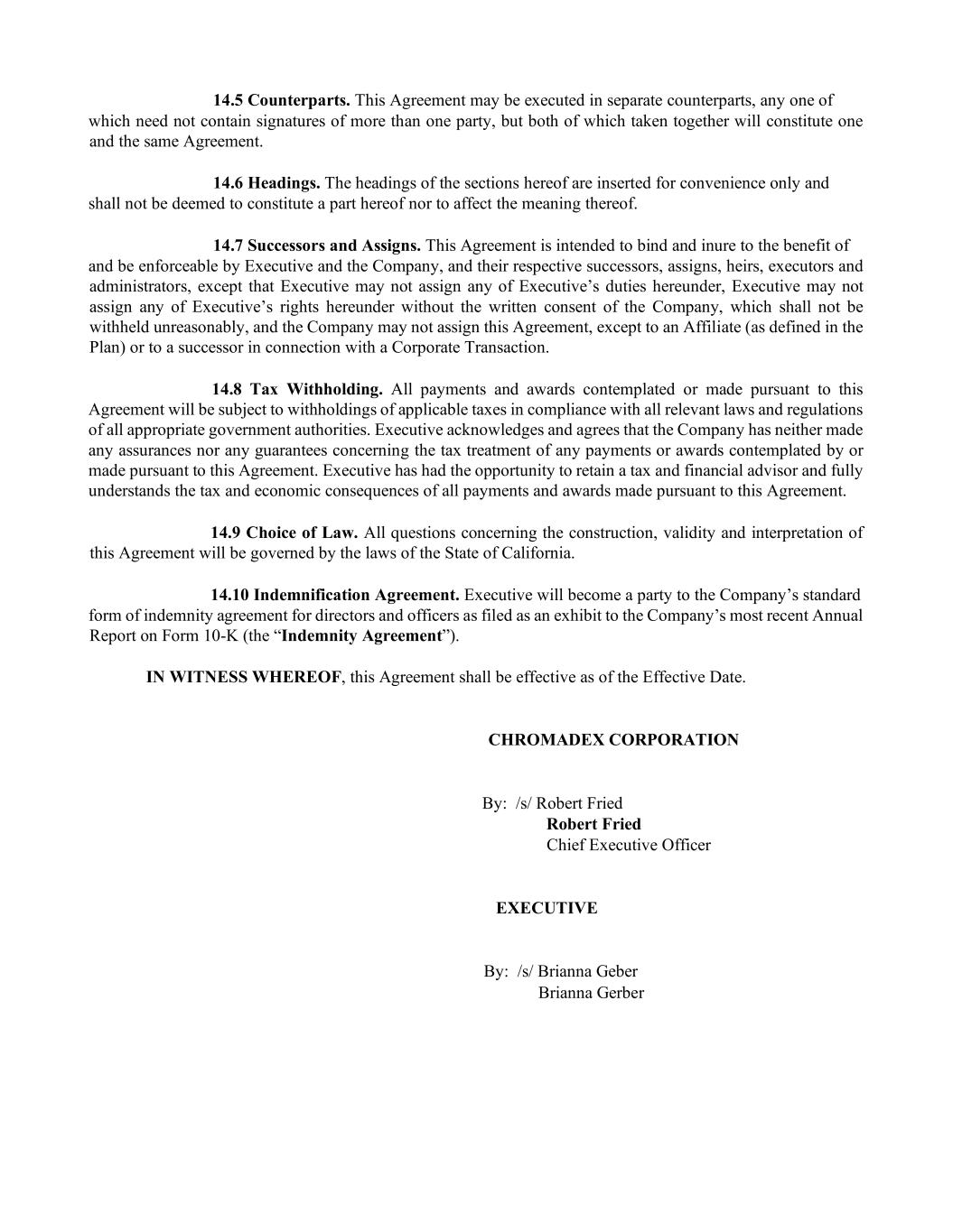 14.5 Counterparts. This Agreement may be executed in separate counterparts, any one of which need not contain signatures of more than one party, but both of which taken together will constitute one and the same Agreement. 14.6 Headings. The headings of the sections hereof are inserted for convenience only and shall not be deemed to constitute a part hereof nor to affect the meaning thereof. 14.7 Successors and Assigns. This Agreement is intended to bind and inure to the benefit of and be enforceable by Executive and the Company, and their respective successors, assigns, heirs, executors and administrators, except that Executive may not assign any of Executive’s duties hereunder, Executive may not assign any of Executive’s rights hereunder without the written consent of the Company, which shall not be withheld unreasonably, and the Company may not assign this Agreement, except to an Affiliate (as defined in the Plan) or to a successor in connection with a Corporate Transaction. 14.8 Tax Withholding. All payments and awards contemplated or made pursuant to this Agreement will be subject to withholdings of applicable taxes in compliance with all relevant laws and regulations of all appropriate government authorities. Executive acknowledges and agrees that the Company has neither made any assurances nor any guarantees concerning the tax treatment of any payments or awards contemplated by or made pursuant to this Agreement. Executive has had the opportunity to retain a tax and financial advisor and fully understands the tax and economic consequences of all payments and awards made pursuant to this Agreement. 14.9 Choice of Law. All questions concerning the construction, validity and interpretation of this Agreement will be governed by the laws of the State of California. 14.10 Indemnification Agreement. Executive will become a party to the Company’s standard form of indemnity agreement for directors and officers as filed as an exhibit to the Company’s most recent Annual Report on Form 10-K (the “Indemnity Agreement”). IN WITNESS WHEREOF, this Agreement shall be effective as of the Effective Date. CHROMADEX CORPORATION By: /s/ Robert Fried Robert Fried Chief Executive Officer EXECUTIVE By: /s/ Brianna Geber Brianna Gerber