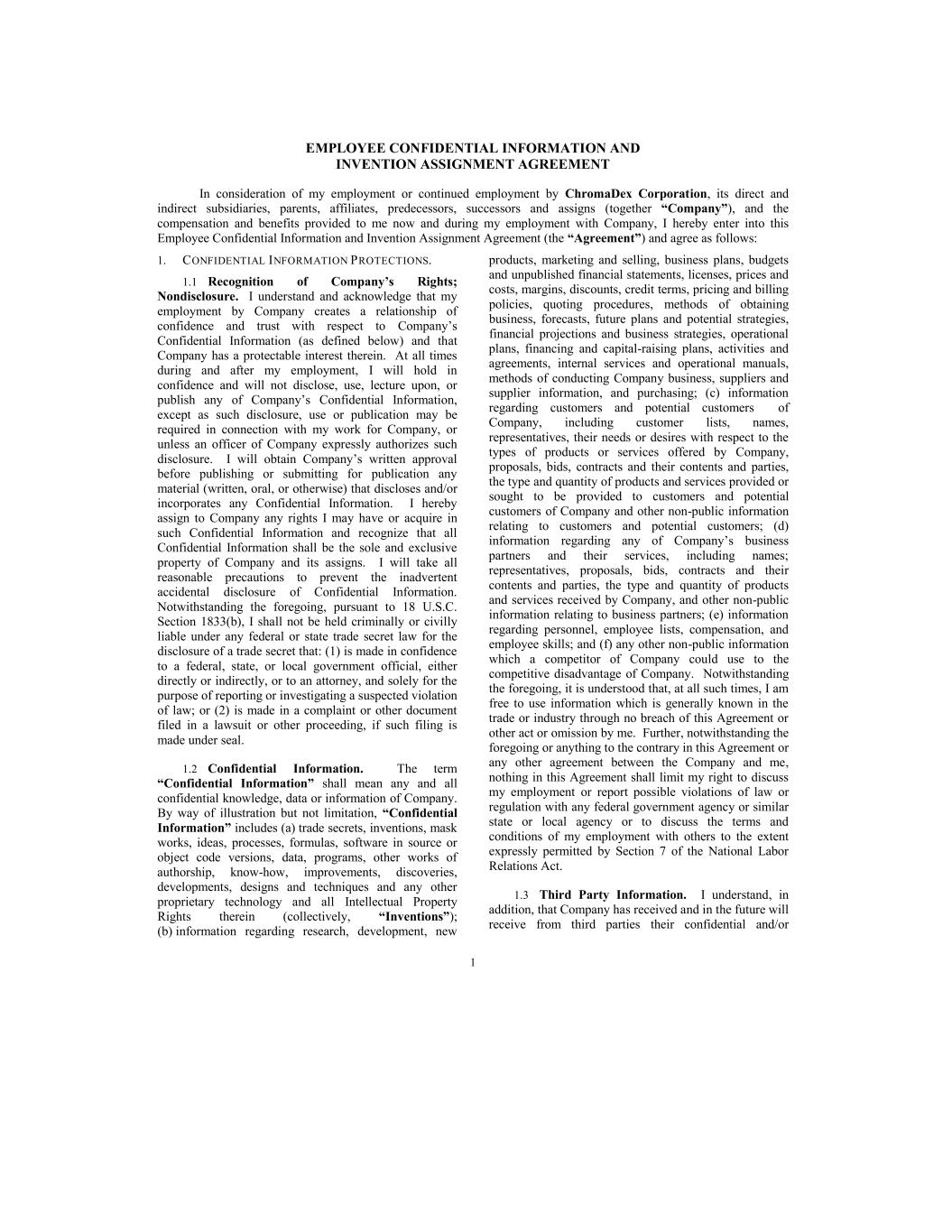 1 EMPLOYEE CONFIDENTIAL INFORMATION AND INVENTION ASSIGNMENT AGREEMENT In consideration of my employment or continued employment by ChromaDex Corporation, its direct and indirect subsidiaries, parents, affiliates, predecessors, successors and assigns (together “Company”), and the compensation and benefits provided to me now and during my employment with Company, I hereby enter into this Employee Confidential Information and Invention Assignment Agreement (the “Agreement”) and agree as follows: 1. CONFIDENTIAL INFORMATION PROTECTIONS. 1.1 Recognition of Company’s Rights; Nondisclosure. I understand and acknowledge that my employment by Company creates a relationship of confidence and trust with respect to Company’s Confidential Information (as defined below) and that Company has a protectable interest therein. At all times during and after my employment, I will hold in confidence and will not disclose, use, lecture upon, or publish any of Company’s Confidential Information, except as such disclosure, use or publication may be required in connection with my work for Company, or unless an officer of Company expressly authorizes such disclosure. I will obtain Company’s written approval before publishing or submitting for publication any material (written, oral, or otherwise) that discloses and/or incorporates any Confidential Information. I hereby assign to Company any rights I may have or acquire in such Confidential Information and recognize that all Confidential Information shall be the sole and exclusive property of Company and its assigns. I will take all reasonable precautions to prevent the inadvertent accidental disclosure of Confidential Information. Notwithstanding the foregoing, pursuant to 18 U.S.C. Section 1833(b), I shall not be held criminally or civilly liable under any federal or state trade secret law for the disclosure of a trade secret that: (1) is made in confidence to a federal, state, or local government official, either directly or indirectly, or to an attorney, and solely for the purpose of reporting or investigating a suspected violation of law; or (2) is made in a complaint or other document filed in a lawsuit or other proceeding, if such filing is made under seal. 1.2 Confidential Information. The term “Confidential Information” shall mean any and all confidential knowledge, data or information of Company. By way of illustration but not limitation, “Confidential Information” includes (a) trade secrets, inventions, mask works, ideas, processes, formulas, software in source or object code versions, data, programs, other works of authorship, know-how, improvements, discoveries, developments, designs and techniques and any other proprietary technology and all Intellectual Property Rights therein (collectively, “Inventions”); (b) information regarding research, development, new products, marketing and selling, business plans, budgets and unpublished financial statements, licenses, prices and costs, margins, discounts, credit terms, pricing and billing policies, quoting procedures, methods of obtaining business, forecasts, future plans and potential strategies, financial projections and business strategies, operational plans, financing and capital-raising plans, activities and agreements, internal services and operational manuals, methods of conducting Company business, suppliers and supplier information, and purchasing; (c) information regarding customers and potential customers of Company, including customer lists, names, representatives, their needs or desires with respect to the types of products or services offered by Company, proposals, bids, contracts and their contents and parties, the type and quantity of products and services provided or sought to be provided to customers and potential customers of Company and other non-public information relating to customers and potential customers; (d) information regarding any of Company’s business partners and their services, including names; representatives, proposals, bids, contracts and their contents and parties, the type and quantity of products and services received by Company, and other non-public information relating to business partners; (e) information regarding personnel, employee lists, compensation, and employee skills; and (f) any other non-public information which a competitor of Company could use to the competitive disadvantage of Company. Notwithstanding the foregoing, it is understood that, at all such times, I am free to use information which is generally known in the trade or industry through no breach of this Agreement or other act or omission by me. Further, notwithstanding the foregoing or anything to the contrary in this Agreement or any other agreement between the Company and me, nothing in this Agreement shall limit my right to discuss my employment or report possible violations of law or regulation with any federal government agency or similar state or local agency or to discuss the terms and conditions of my employment with others to the extent expressly permitted by Section 7 of the National Labor Relations Act. 1.3 Third Party Information. I understand, in addition, that Company has received and in the future will receive from third parties their confidential and/or